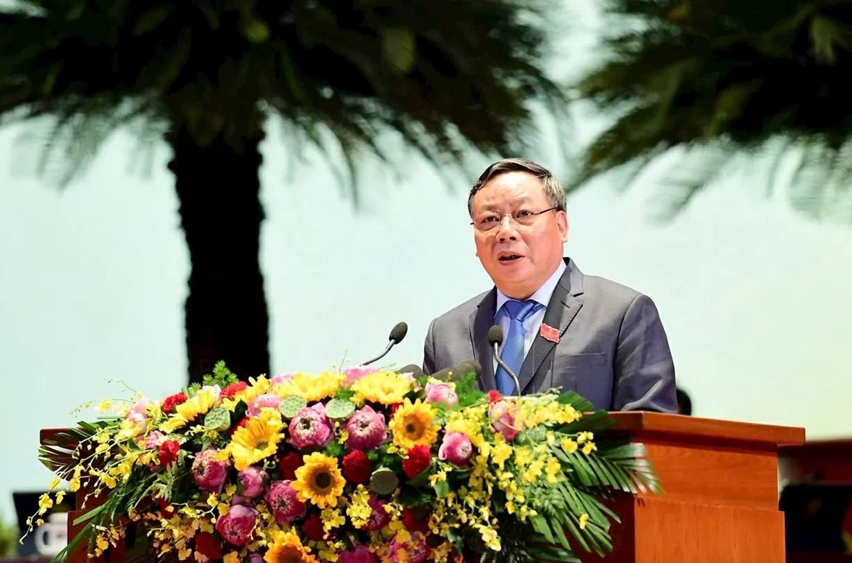 Phó Bí thư Thường trực Thành ủy Hà Nội Nguyễn Văn Phong trình bày Báo cáo chính trị Đại hội đại biểu Đảng bộ thành phố Hà Nội lần thứ XVIII. (Ảnh: Viết Thành)
