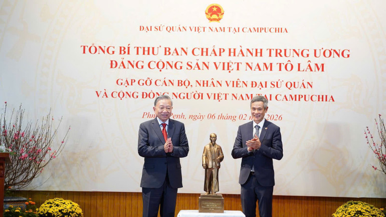 Tại buổi gặp mặt, Tổng Bí thư Tô Lâm trao tặng Đại sứ quán Việt Nam tại Campuchia món quà lưu niệm là bức tượng Chủ tịch Hồ Chí Minh kính yêu; tặng cộng đồng người gốc Việt tại Campuchia nhiều phần quà ý nghĩa.