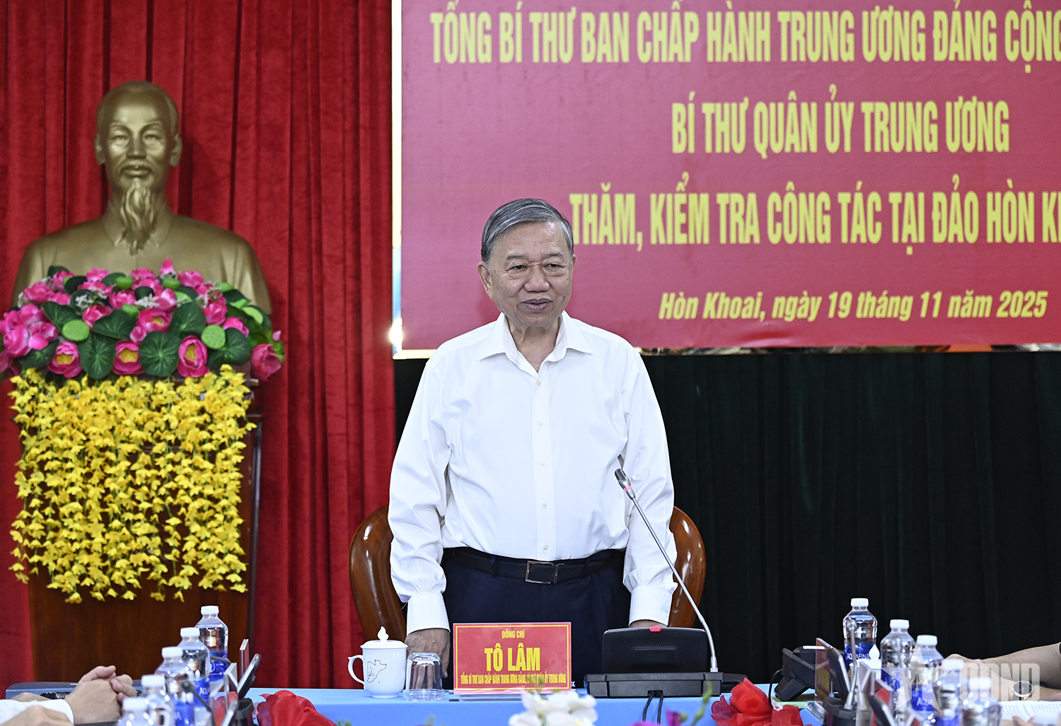 Thời gian sắp tới, khối lượng công việc còn nhiều yêu cầu, tiến độ càng cao. Tổng Bí thư mong lãnh đạo tỉnh phải thường xuyên có mặt tại hiện trường, phân công lãnh đạo kịp thời động viên tinh thần và bảo đảm điều kiện vật chất cho cán bộ, chiến sĩ, kỹ sư, công nhân. Mỗi chuyến ra đảo, mỗi lời thăm hỏi, mỗi sự hỗ trợ đúng lúc sẽ tiếp thêm sức mạnh để anh em bám trụ vượt nắng gió, vượt sóng lớn, giữ vững nhịp độ thi công. Tinh thần và vật chất phải đi cùng nhau, chăm lo tốt cho lực lượng trên đảo chính là chăm lo cho tiến độ, chất lượng công trình và an ninh nơi tuyến đầu Tổ quốc.