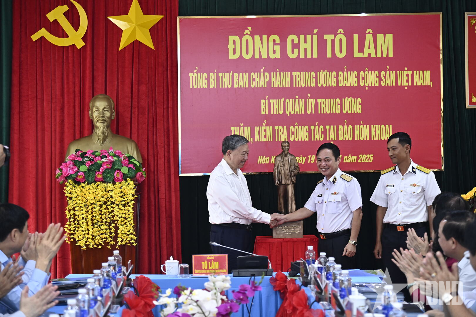 Theo Tổng Bí thư, cần nhất quán cam kết thiêng liêng với vùng đất này, Hòn Khoai không chỉ là một công trình, đó là lời thề của quốc gia, là bước tiến của một Việt Nam khát vọng và tự cường, trước mắt là nhiệm vụ lớn, thời gian gấp, điều kiện khắc nghiệt nhưng tinh thần Việt Nam chưa bao giờ khuất phục, khó khăn, chỉ là phép thử sóng gió, chỉ là cửa ải ý chí mới là sức mạnh, quyết định. Tổng Bí thư nhấn mạnh: Tất cả các cán bộ, chiến sĩ bộ đội chúng ta phát huy sức mạnh, tinh thần Bộ đội Cụ Hồ, quyết tâm hoàn thành kế hoạch đề ra. Làm nhanh nhưng không ẩu, làm khó nhưng không nản. Làm ít phải đúng, làm nhiều càng phải chuẩn. Hòn Khoai đang gọi chúng ta tiến bước. Cán bộ, chiến sĩ, công nhân trên đảo hãy khắc sâu điều này: Mỗi giờ làm việc là một tấc chủ quyền. Mỗi nhịp cầu, mỗi cọc biển là dấu son của Tổ quốc. Gian khó không được chùn chân; sóng gió không được chậm bước. Khó đến đâu quyết làm đến đó. Bởi chúng ta đang dựng nên không chỉ một cảng biển mà là thế đứng của đất nước trên biển lớn. Chúng ta không chỉ mở ra đảo mà đang mở đường cho tương lai Việt Nam.