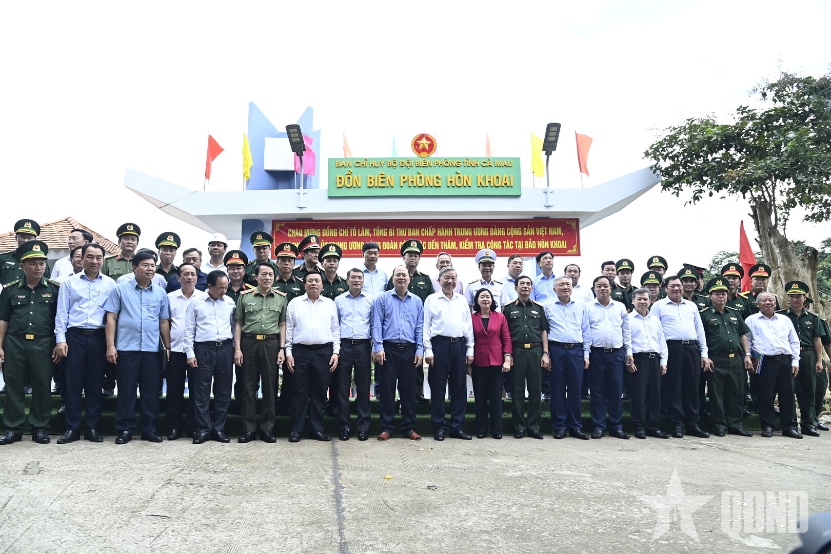Tổng Bí thư Tô Lâm chụp ảnh lưu niệm cùng cán bộ, chiến sĩ các đơn vị đóng quân trên đảo Hòn Khoai và Đảng bộ, chính quyền tỉnh Cà Mau.