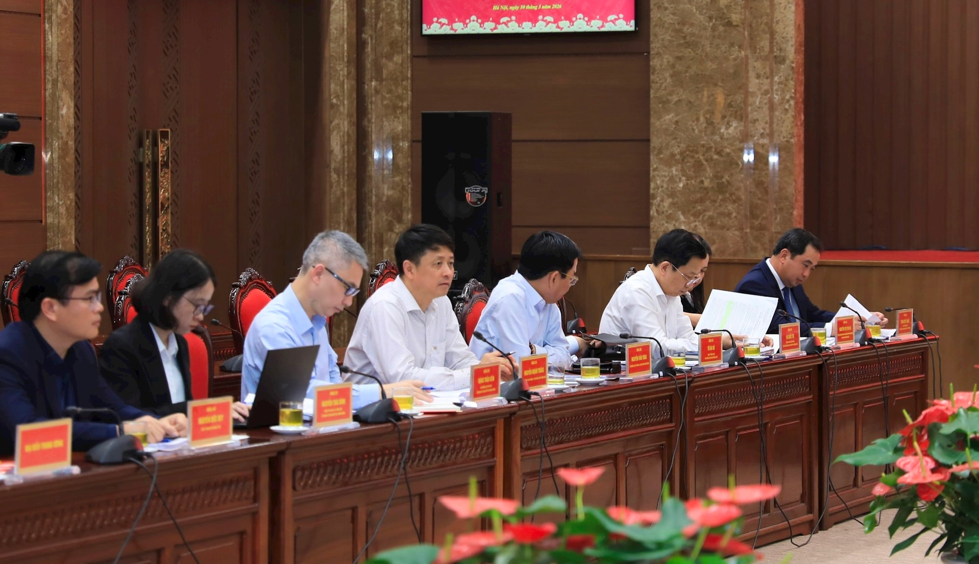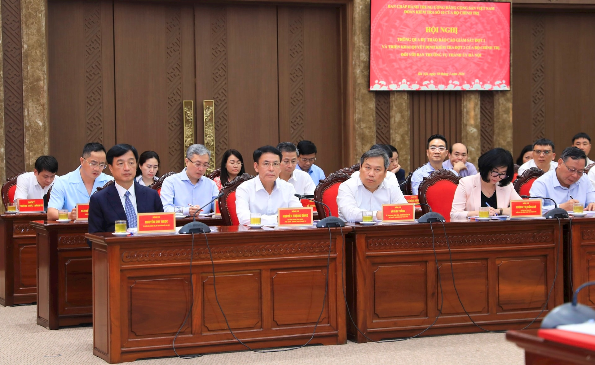 Đại biểu thành phố Hà Nội làm việc với Đoàn có các đồng chí: Ủy viên Bộ Chính trị, Bí thư Thành ủy Nguyễn Duy Ngọc; Ủy viên Trung ương Đảng, Phó Bí thư Thường trực Thành ủy Nguyễn Trọng Đông; Ủy viên Trung ương Đảng, Phó Bí thư Thành ủy, Chủ tịch UBND thành phố Vũ Đại Thắng; Phó Bí thư Thành ủy, Chủ tịch HĐND thành phố Phùng Thị Hồng Hà; Phó Bí thư Thành ủy Nguyễn Văn Phong.