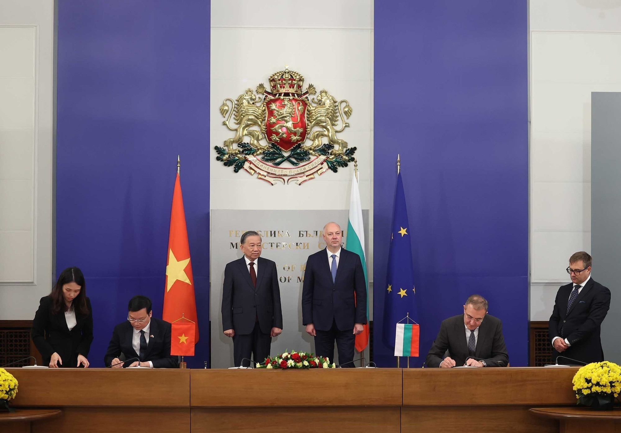 Tổng Bí thư Tô Lâm và Thủ tướng Bulgaria Rosen Zhelyazkov chứng kiến lễ ký Bản ghi nhớ hợp tác giữa Bộ Nội vụ Việt Nam với Bộ Lao động và Chính sách xã hội Bulgaria về hợp tác trong lĩnh vực lao động và chính sách xã hội. (Ảnh: THỐNG NHẤT/TTXVN)