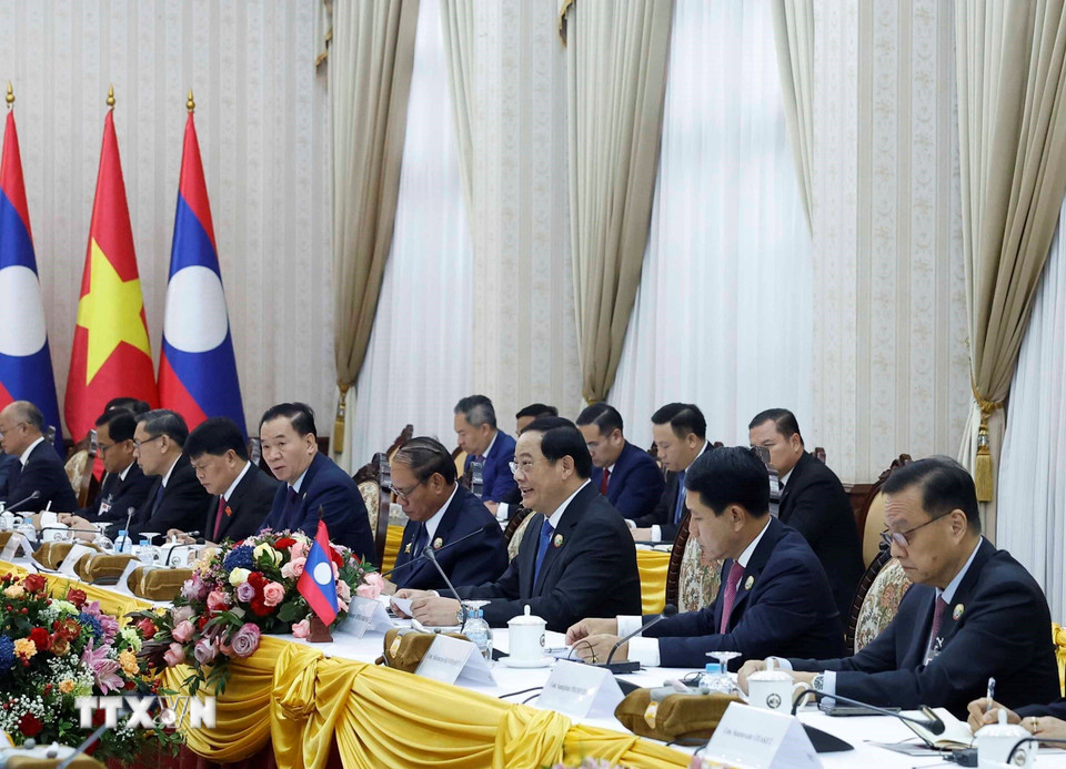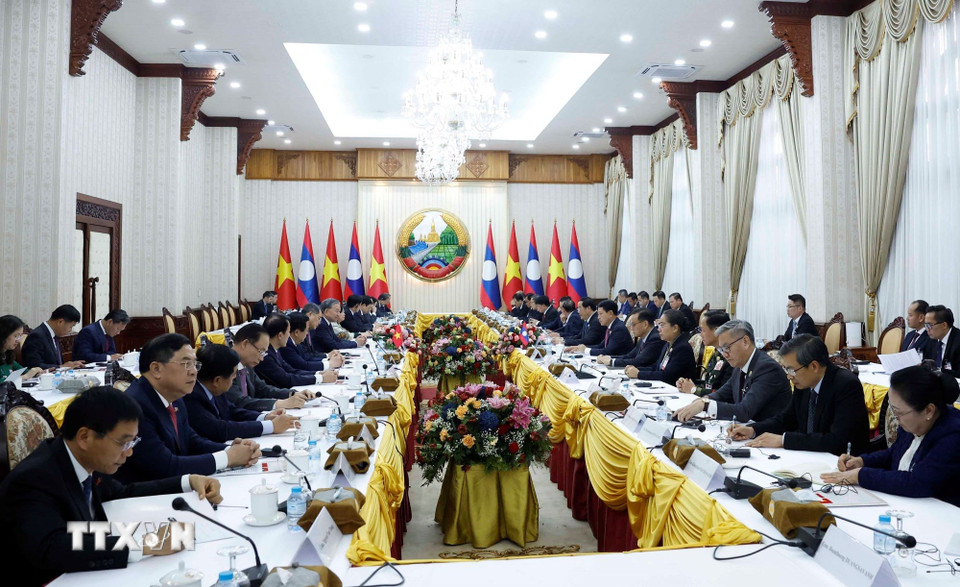 Tổng Bí thư Tô Lâm hội kiến Thủ tướng Lào Sonexay Siphandone. (Ảnh: Thống Nhất/TTXVN)