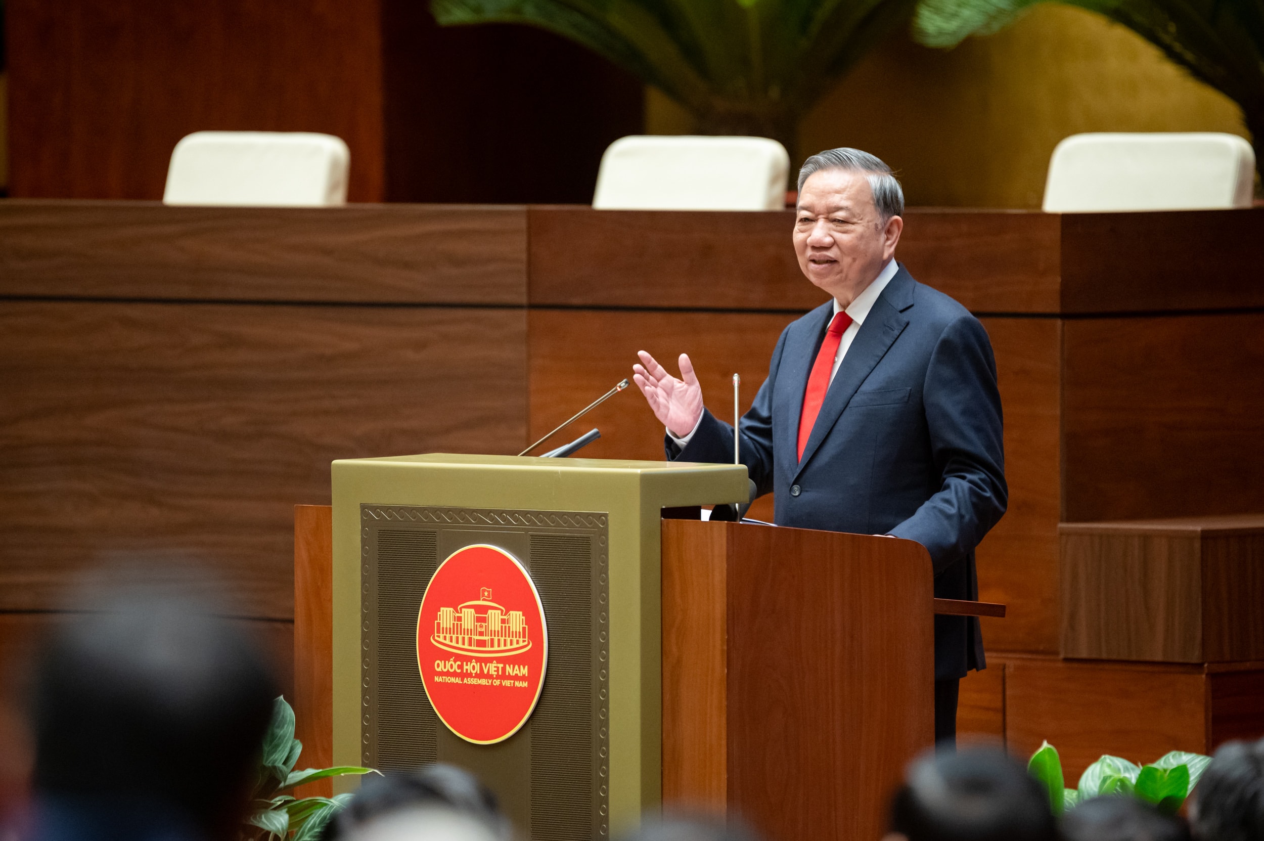 Tổng Bí thư Tô Lâm, Chủ tịch nước Lương Cường, Thủ tướng Chính phủ Phạm Minh Chính, Chủ tịch Quốc hội Trần Thanh Mẫn và các đại biểu dự Hội nghị toàn quốc quán triệt, triển khai thực hiện Nghị quyết số 79-NQ/TW và Nghị quyết số 80-NQ/TW của Bộ Chính trị. Ảnh: Phạm Thắng