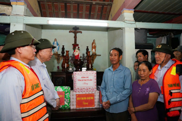 Tổng Bí thư căn dặn, trong lúc khó khăn do thiên tai, mọi người cần phát huy tinh thần tương thân, tương ái, giúp đỡ lẫn nhau, chung sức khắc phục hậu quả, sớm ổn định đời sống.