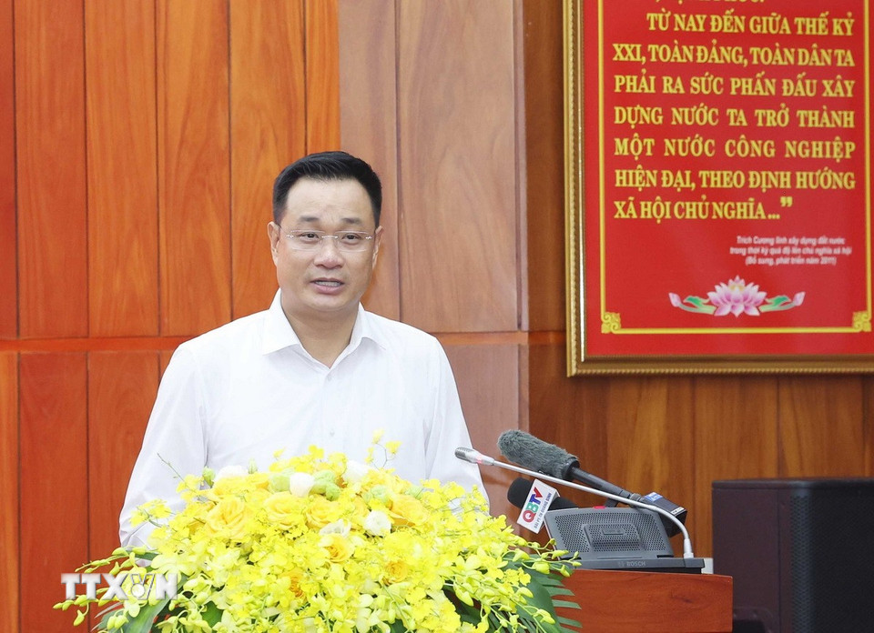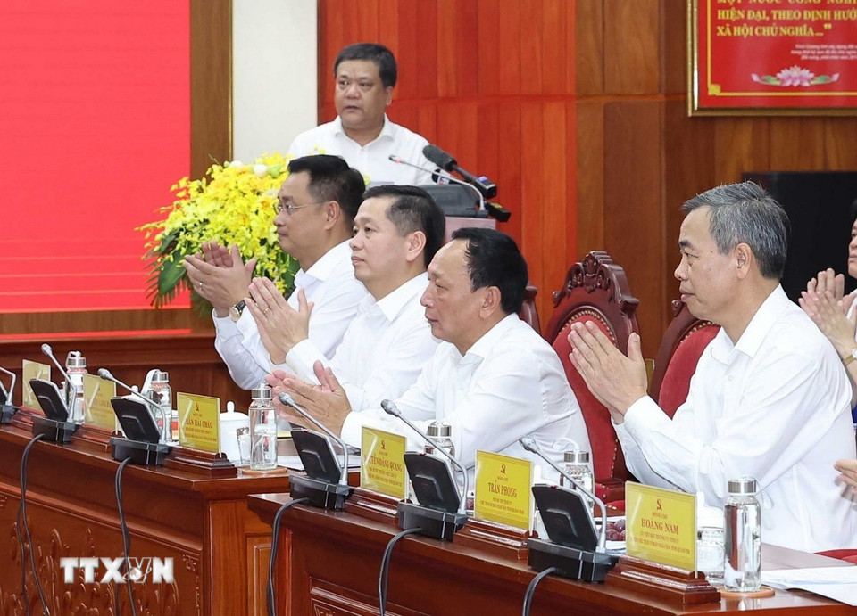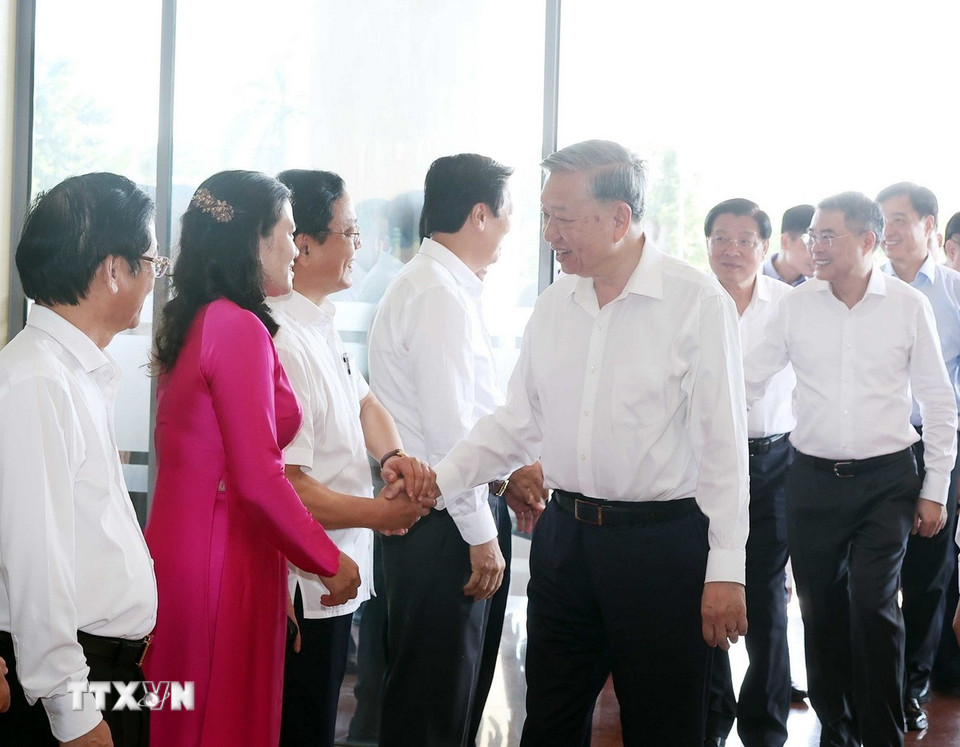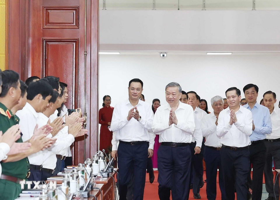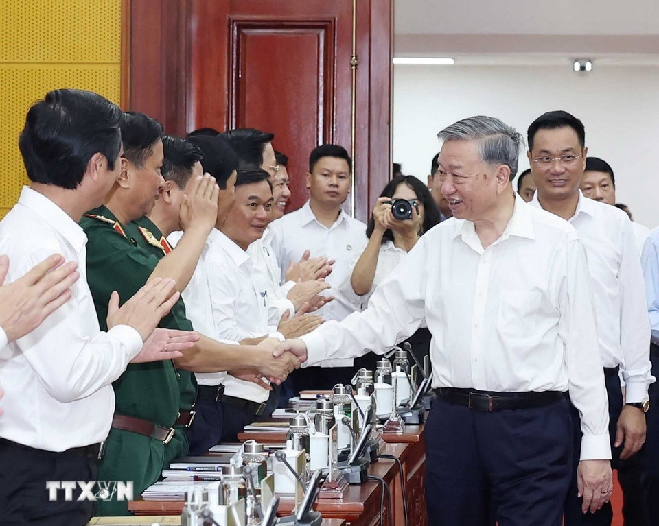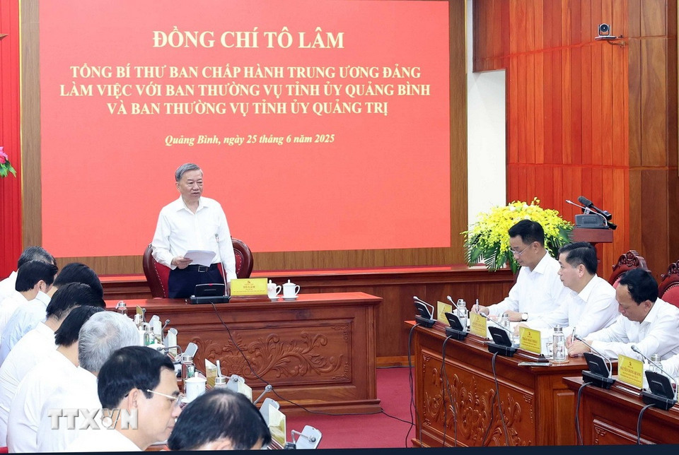 Tổng Bí thư Tô Lâm đến dự buổi làm việc với Ban Thường vụ Tỉnh ủy Quảng Bình và Ban Thường vụ Tỉnh ủy Quảng Trị về kết quả triển khai thực hiện các nghị quyết, kết luận của Trung ương và một số nhiệm vụ trọng tâm phát triển kinh tế-xã hội, đảm bảo quốc phòng, an ninh trên địa bàn hai tỉnh. (Ảnh: Thống Nhất/TTXVN)