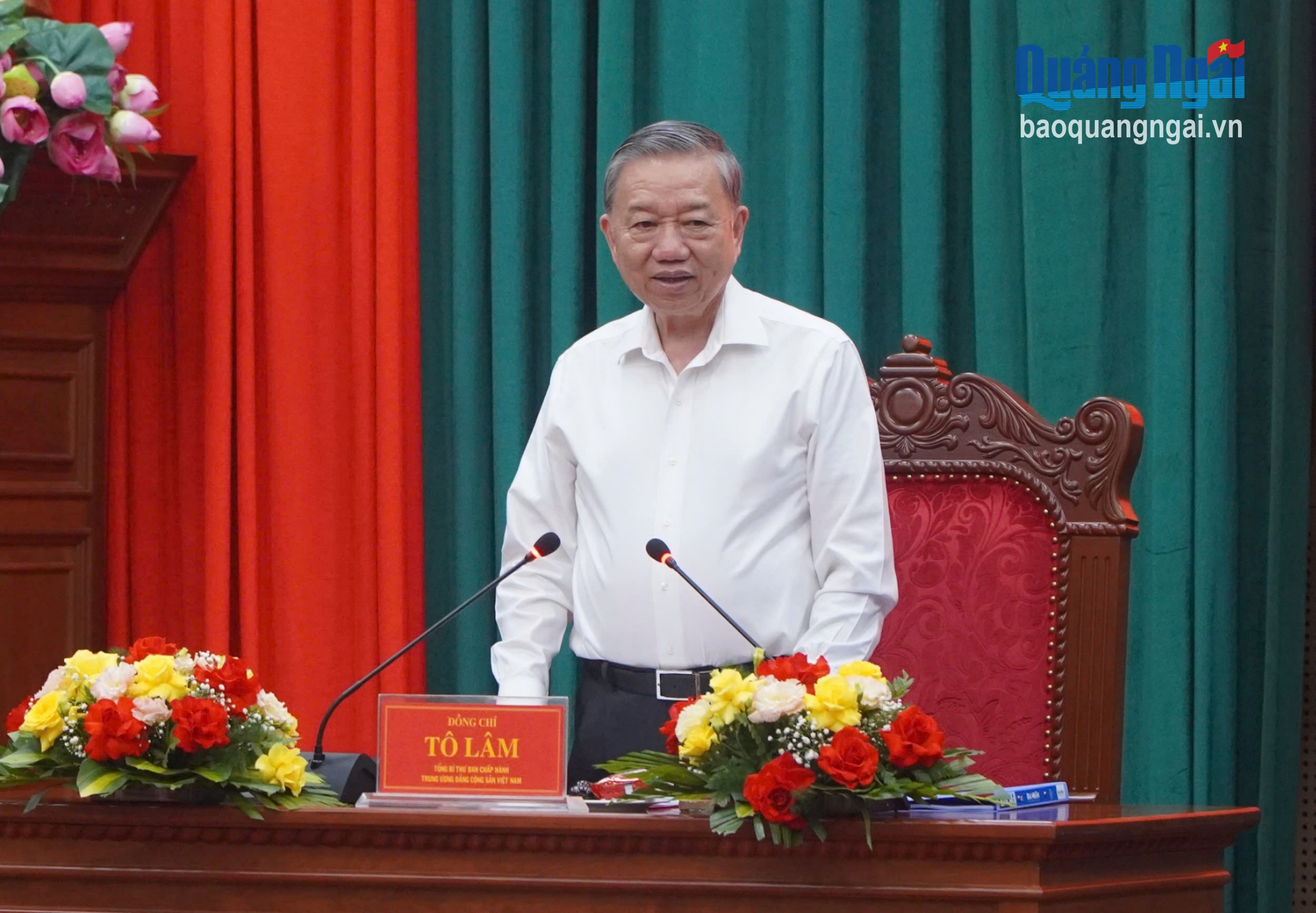 Về sắp xếp, tinh gọn tổ chức bộ máy, hợp nhất đơn vị hành chính cấp tỉnh, cấp xã, xây dựng mô hình tổ chức chính quyền địa phương 2 cấp, không tổ chức cấp huyện, Tổng Bí thư Tô Lâm nhấn mạnh, đây là một chủ trương lớn, đúng với ý Đảng và hợp lòng dân. Đây cũng là cơ hội lịch sử để tỉnh Kon Tum và tỉnh Quảng Ngãi cùng nhau phát huy tiềm năng, thế mạnh của 2 địa phương; quy hoạch tầm nhìn dài hạn; chia sẻ lợi ích, trách nhiệm, khát vọng phát triển, nhằm xây dựng tỉnh Quảng Ngãi mới phát triển giàu mạnh.