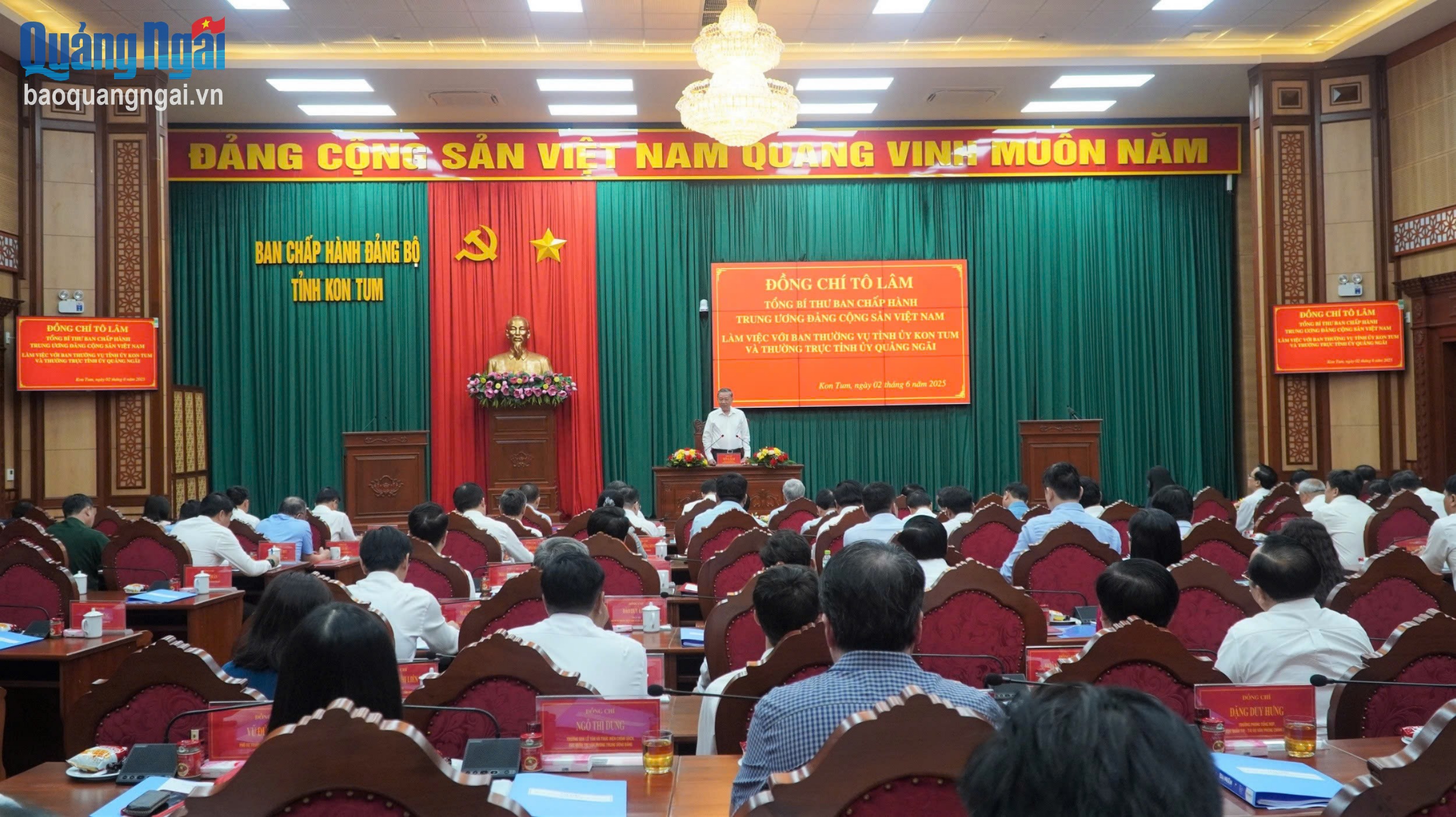 Phát biểu chỉ đạo tại buổi làm việc, Tổng Bí thư Tô Lâm ghi nhận và biểu dương những kết quả mà Đảng bộ tỉnh Kon Tum và Đảng bộ tỉnh Quảng Ngãi đã đạt được trong thời gian qua. Tổng Bí thư Tô Lâm nhấn mạnh, từ những khó khăn, thách thức ban đầu về hạ tầng, với quy mô kinh tế nhỏ, tỉnh Kon Tum và tỉnh Quảng Ngãi đã tận dụng tốt các tiềm năng, lợi thế để phát triển và đạt được những thành tựu quan trọng, khá toàn diện trên tất cả các lĩnh vực; thể hiện rõ bản lĩnh chính trị, tinh thần đổi mới, sáng tạo và ý chí vươn lên mạnh mẽ.