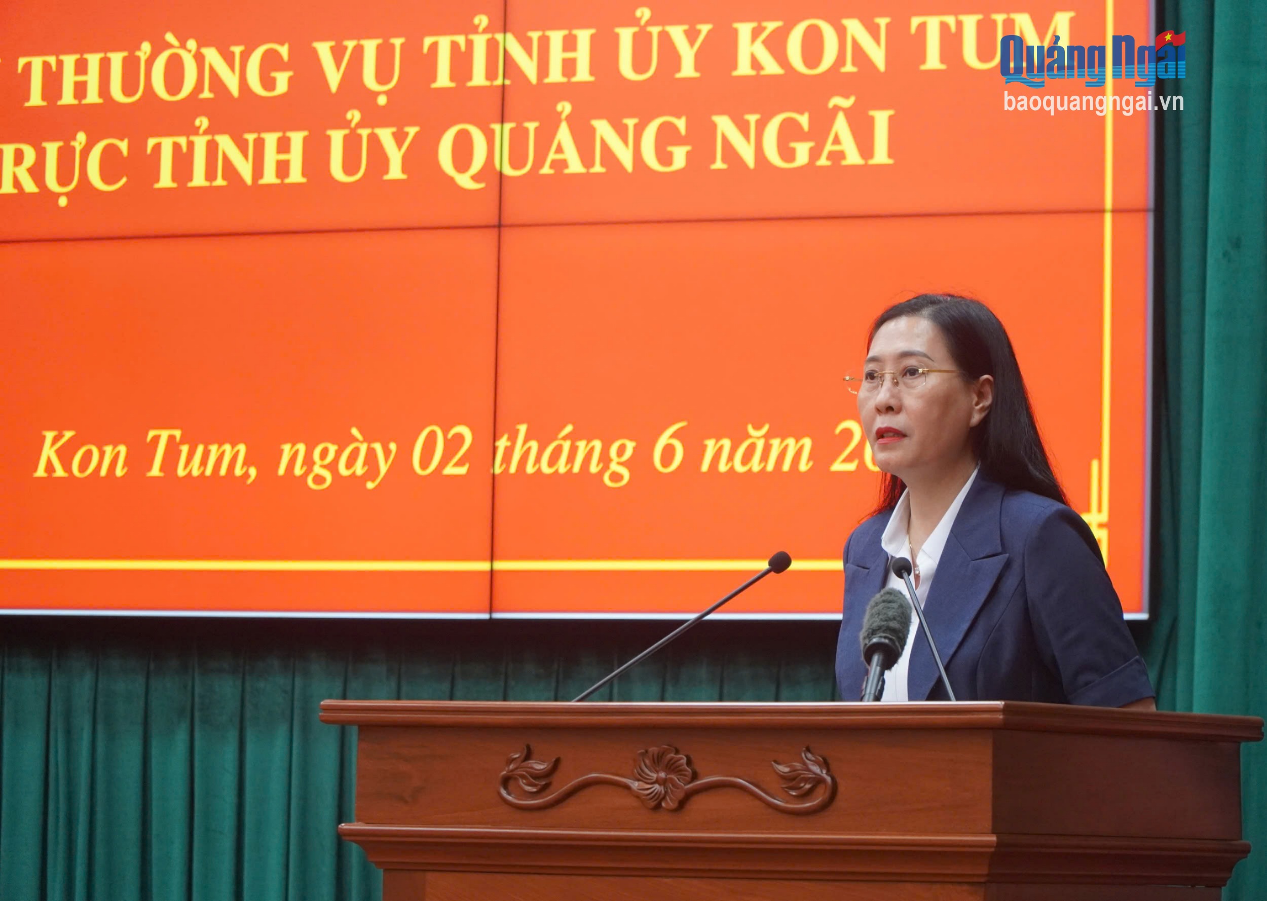 Tại buổi làm việc, Ủy viên Trung ương Đảng, Bí thư Tỉnh ủy, Chủ tịch HĐND tỉnh Kon Tum Dương Văn Trang và Ủy viên Trung ương Đảng, Bí thư Tỉnh ủy, Chủ tịch HĐND tỉnh Quảng Ngãi Bùi Thị Quỳnh Vân đã báo cáo kết quả về việc triển khai thực hiện các nghị quyết, kết luận của trung ương trong thời gian gần đây; việc sắp xếp, tinh gọn tổ chức bộ máy, đơn vị hành chính; công tác xây dựng Đảng; tình hình phát triển kinh tế, xã hội, quốc phòng, an ninh; công tác an sinh xã hội trên địa bàn 2 tỉnh.