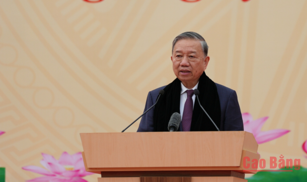 Tổng Bí thư Tô Lâm phát biểu tại buổi gặp mặt, nói chuyện với nhân dân các dân tộc tỉnh Cao Bằng.