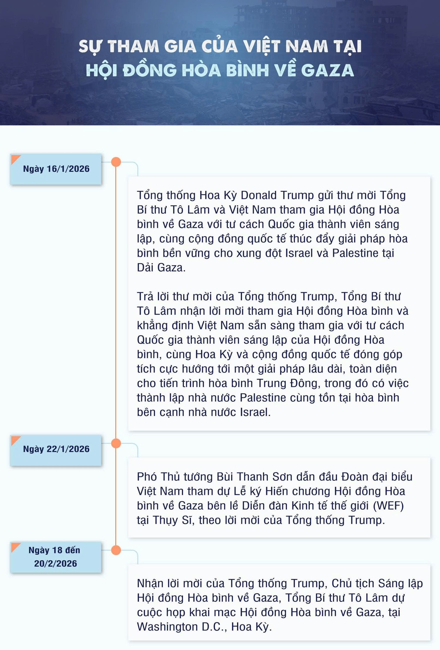 Ngày 16/1, Tổng thống Hoa Kỳ Donald Trump đã gửi thư tới Tổng Bí thư Tô Lâm, mời Tổng Bí thư Tô Lâm và Việt Nam tham gia Hội đồng Hòa bình Dải Gaza với tư cách Quốc gia Thành viên Sáng lập, cùng cộng đồng quốc tế thúc đẩy giải pháp hòa bình bền vững cho xung đột giữa Israel và Palestine tại Dải Gaza.