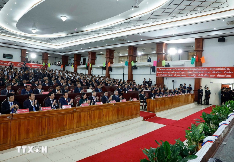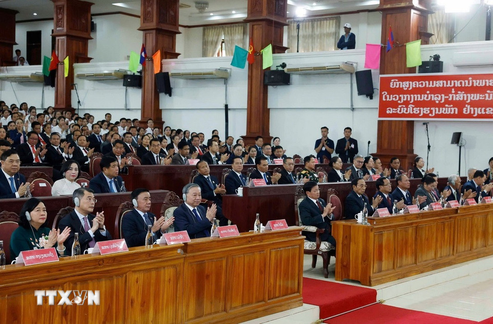 Tổng Bí thư Tô Lâm và Tổng Bí thư, Chủ tịch nước Lào Thongloun Sisoulith cùng các lãnh đạo cấp cao của hai nước và đại biểu tại sự kiện. (Ảnh: Thống Nhất/TTXVN)