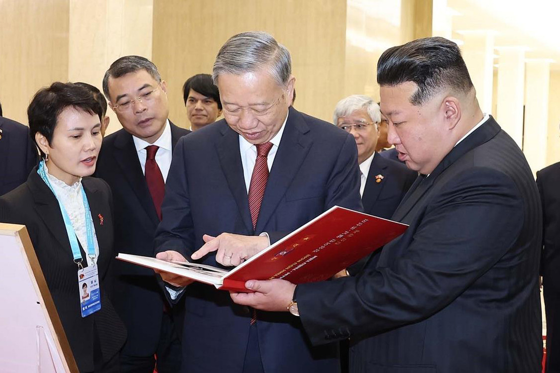 Sau khi hội đàm, Tổng Bí thư Tô Lâm trao tặng Tổng Bí thư, Chủ tịch Quốc vụ Triều Tiên Kim Jong Un cuốn sách ảnh "Thắm tình hữu nghị Việt Nam - Triều Tiên". Ảnh: TTXVN