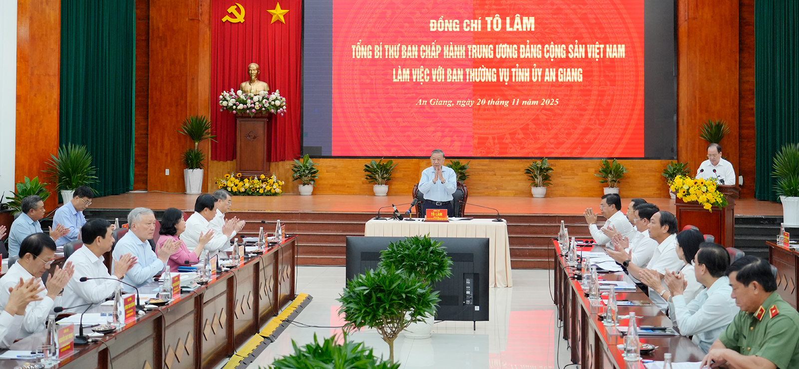 Phát biểu chỉ đạo buổi làm việc, Tổng Bí thư Tô Lâm khẳng định, An Giang là vùng đất giàu truyền thống cách mạng, đậm nét văn hóa, có vị trí chiến lược đặc biệt quan trọng, vừa là tỉnh đầu nguồn sông Cửu Long, vừa là cánh cửa vươn ra biển phía Tây của Tổ quốc. An Giang là vùng đất kết tinh chiều sâu của lịch sử và văn hóa. Tỉnh vừa có lợi thế, nhưng cũng là trách nhiệm rất lớn đối với sự phát triển chung của đồng bằng sông Cửu Long và cả nước.