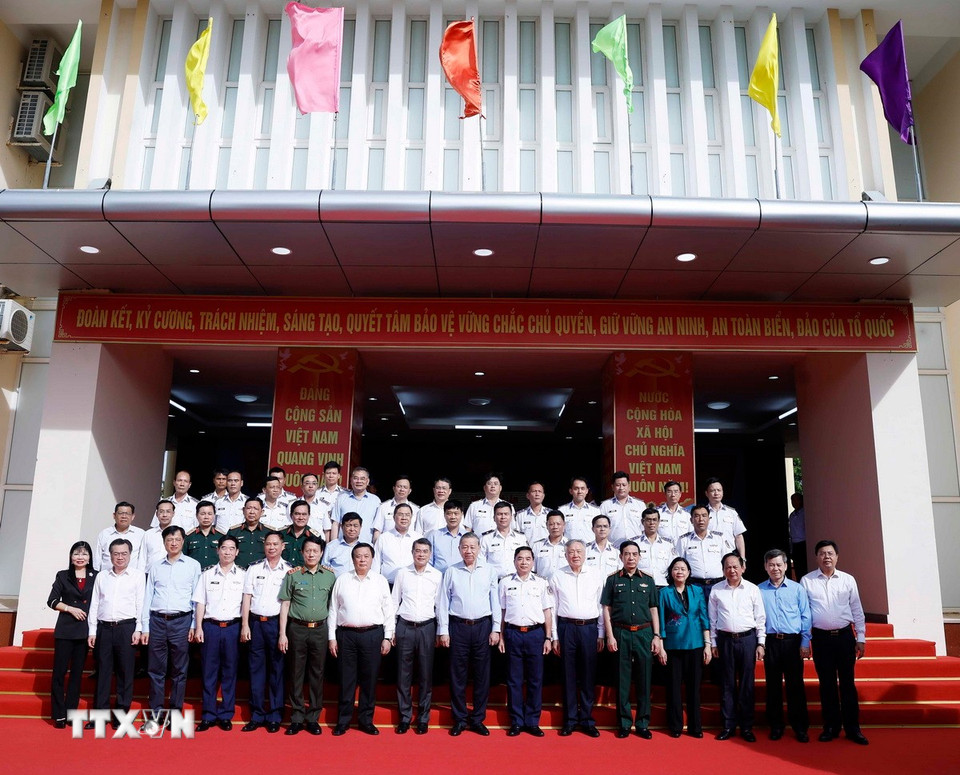 Tổng Bí thư Tô Lâm với các đại biểu tại Bộ Tư lệnh Vùng Cảnh sát Biển 4. (Ảnh: Thống Nhất/TTXVN)