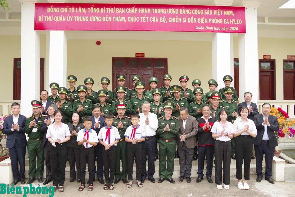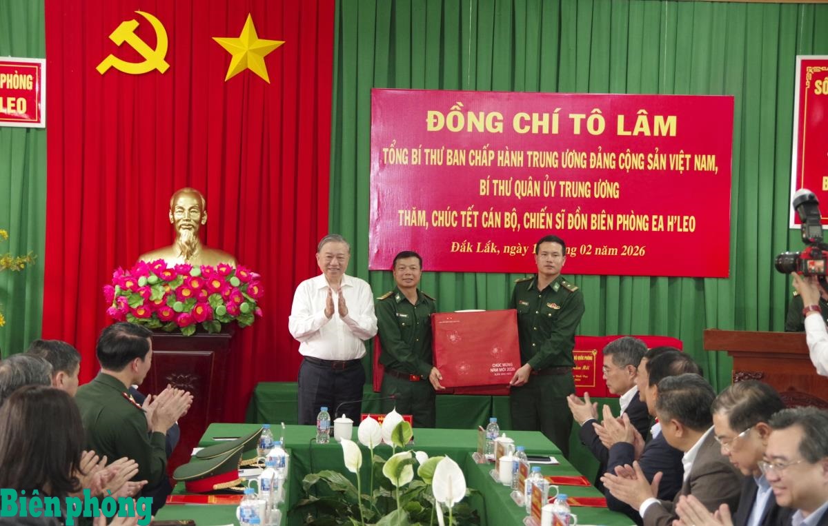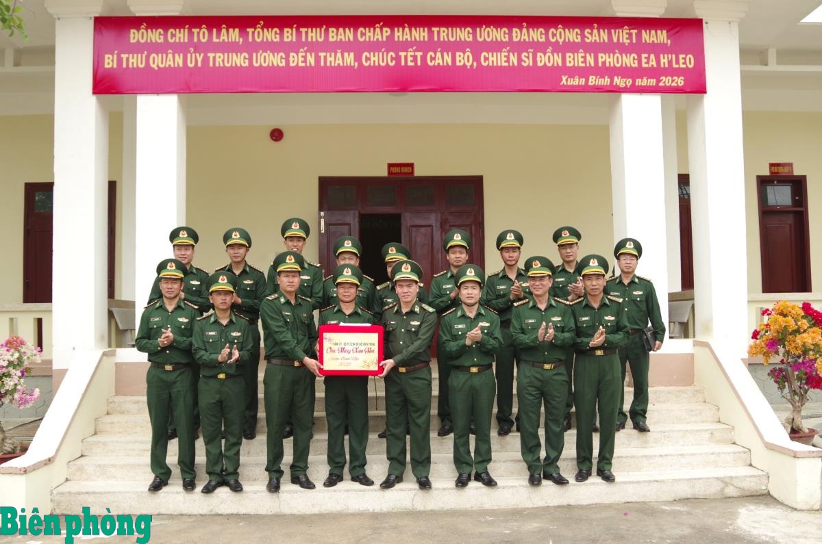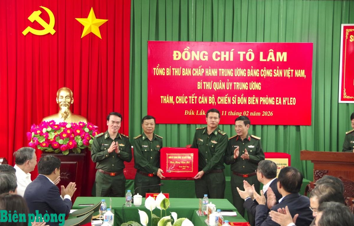 Trong không khí đầm ấm chuẩn bị đón Tết cổ truyền Bính Ngọ 2026 của dân tộc, Tổng Bí thư Tô Lâm gửi lời chúc tốt đẹp nhất tới cán bộ, chiến sĩ Đồn Biên phòng Ea H’Leo nói riêng, Bộ đội Biên phòng tỉnh Đắk Lắk nói chung. Nhân dịp năm mới, Tổng Bí thư đã trao tặng phần quà ý nghĩa cho cán bộ, chiến sĩ Đồn Biên phòng Ea H’Leo. Dịp này, Đại tướng Phan Văn Giang đã trao tặng cán bộ, chiến sĩ Đồn Biên phòng Ea H’Leo phần quà Tết của Bộ Quốc phòng.