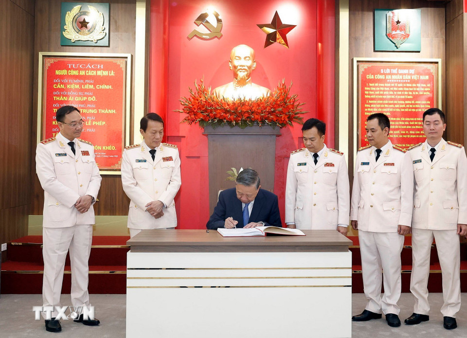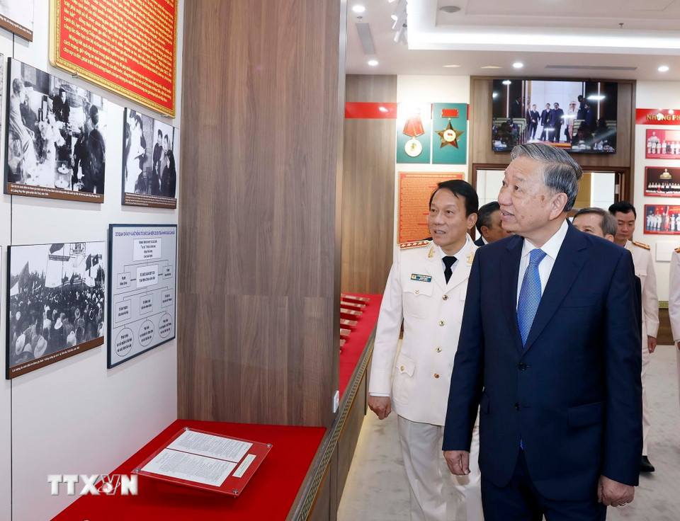 Tổng Bí thư Tô Lâm thăm phòng truyền thống của Cục An ninh điều tra (Bộ Công an). (Ảnh: Thống Nhất/TTXVN)