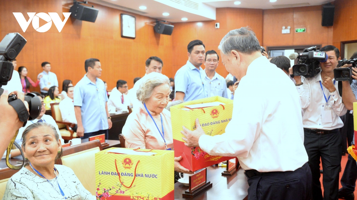 Thay mặt lãnh đạo Đảng, Nhà nước, thân ái gửi tới các lãnh đạo, nguyên lãnh đạo, lão thành cách mạng, các Mẹ Việt Nam Anh hùng, Anh hùng LLVT, Anh hùng lao động, các gia đình chính sách, cùng toàn thể đồng bào, đồng chí TP. Hồ Chí Minh lời thăm hỏi ân cần và lời chúc mừng năm mới tốt đẹp nhất, Tổng Bí thư Tô Lâm đánh giá cao những nỗ lực, cố gắng và kết quả mà Đảng bộ, chính quyền và nhân dân thành phố đã đạt được trong thời gian qua.