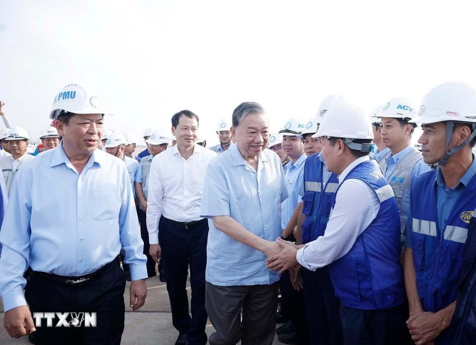Tổng Bí thư Tô Lâm với cán bộ, công nhân, người lao động thi công Dự án Cảng Hàng không quốc tế Long Thành.