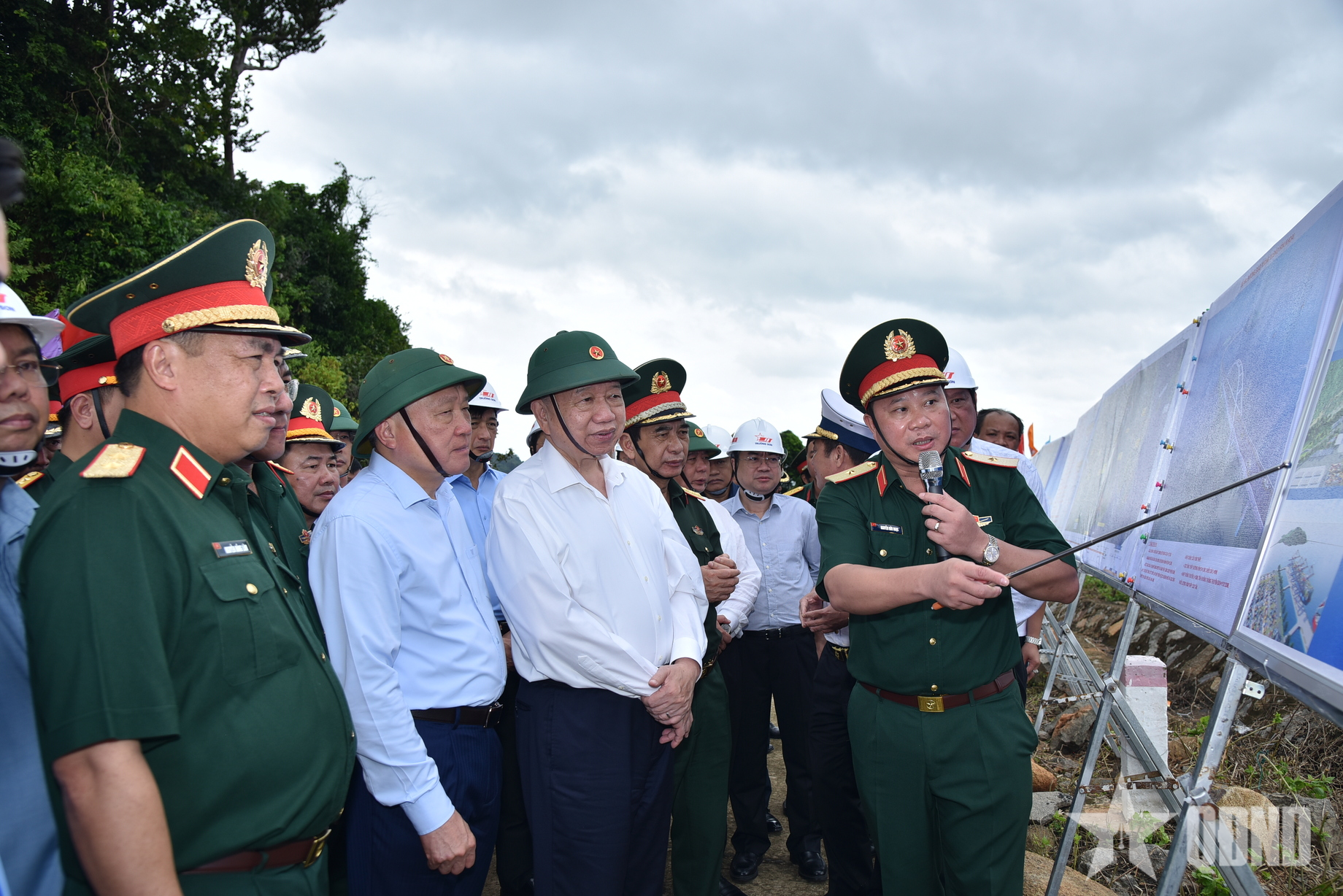 Đồng chí Tổng Bí thư đã kiểm tra tình hình triển khai 2 dự án: Tuyến đường giao thông ra đảo Hòn Khoai và Cảng tổng hợp lưỡng dụng Hòn Khoai. Các công trình do Quân chủng Hải quân và Binh đoàn 12 thực hiện, được khởi công ngày 19-8-2025. Đây đều là những dự án có ý nghĩa đặc biệt quan trọng, mang tính chiến lược đối với phát triển bền vững, đồng thời góp phần bảo đảm quốc phòng và an ninh cho vùng cực Nam Tổ quốc.