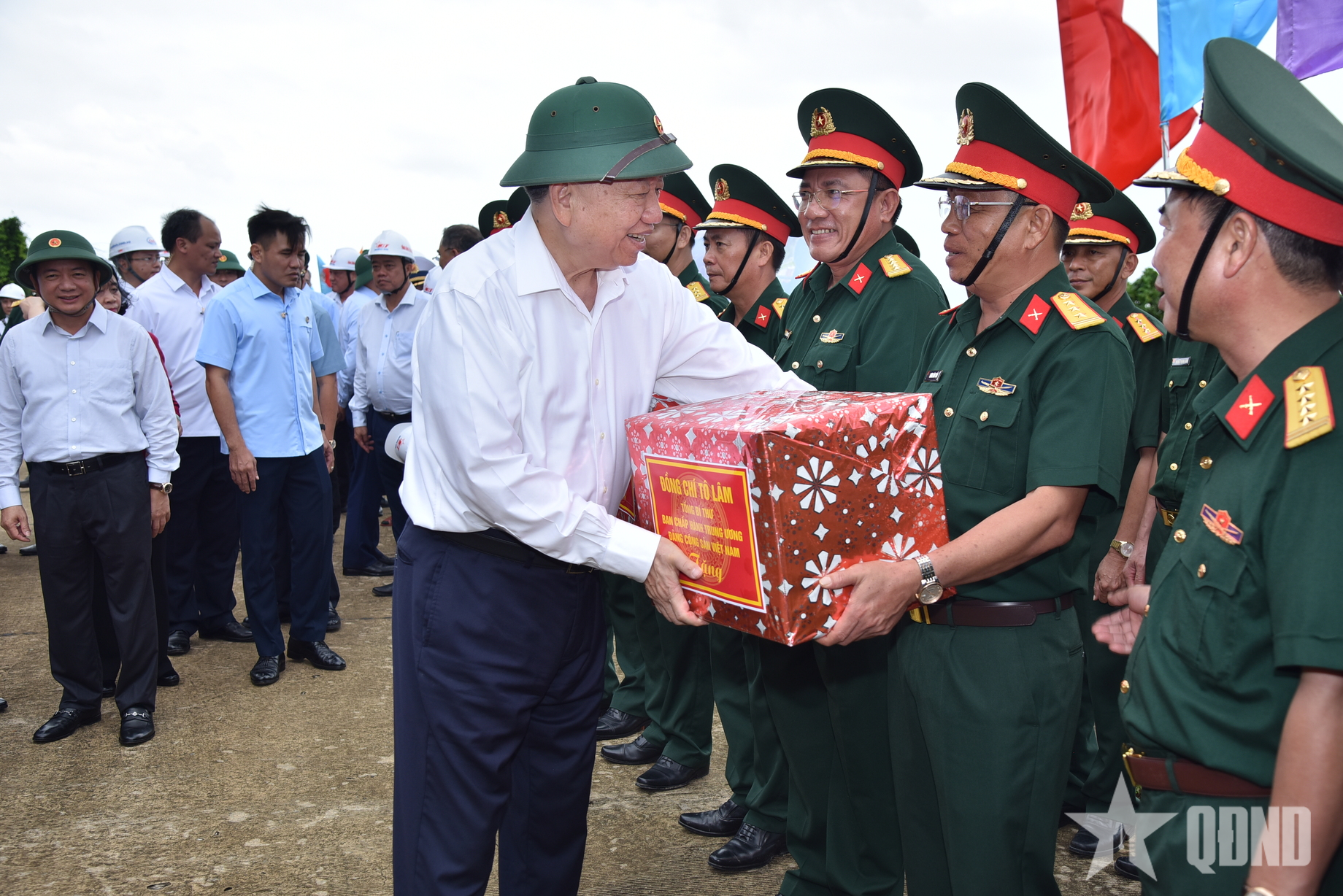 Tổng Bí thư Tô Lâm cùng đoàn công tác tặng quà các đơn vị đang thi công 2 công trình trọng điểm trên địa bàn Hòn Khoai, xã Đất Mũi, tỉnh Cà Mau.