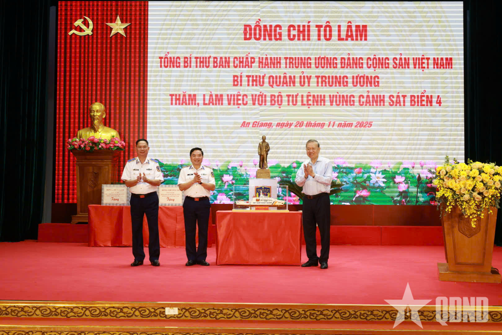 Tại buổi làm việc, thay mặt Lãnh đạo Đảng, Nhà nước, Tổng Bí thư Tô Lâm biểu dương, ghi nhận những cố gắng và sự nỗ lực phấn đấu khắc phục mọi khó khăn, gian khổ, hoàn thành xuất sắc nhiệm vụ của lực lượng Cảnh sát biển Việt Nam, trong đó có cán bộ, chiến sĩ Bộ tư lệnh Vùng Cảnh sát biển 4; đánh giá cao các cơ quan Trung ương, Quân ủy Trung ương, Bộ Quốc phòng, cấp ủy, chính quyền, đoàn thể và nhân dân các địa phương đã luôn tận tình giúp đỡ và tạo điều kiện để lực lượng Cảnh sát biển Việt Nam hoàn thành xuất sắc mọi nhiệm vụ được giao.