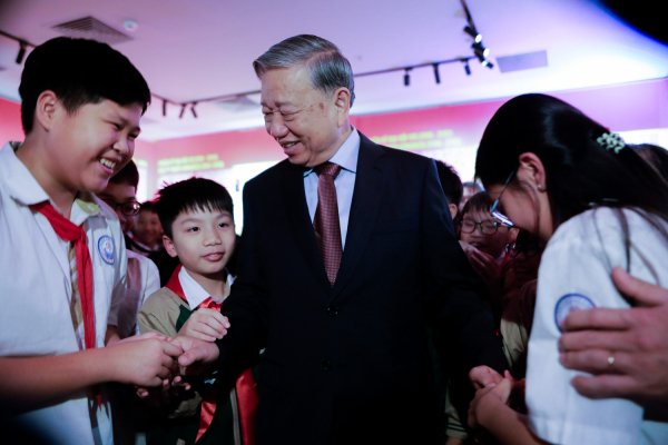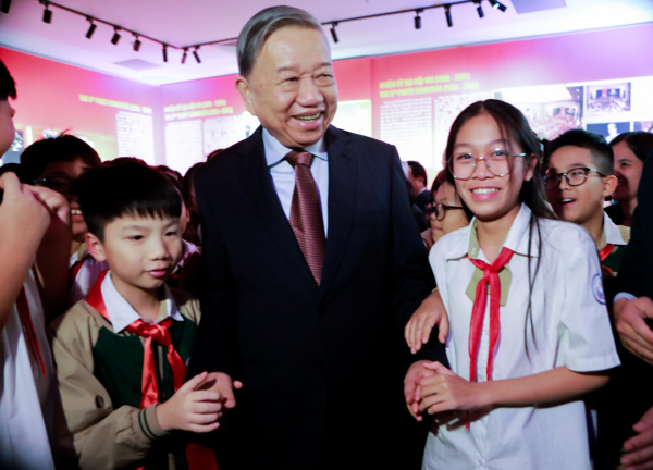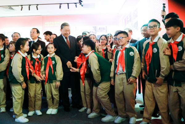 Tổng Bí thư Tô Lâm và các em học sinh tại triển lãm.
