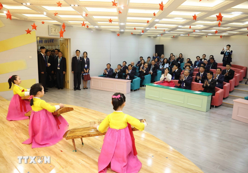 Tổng Bí thư Tô Lâm và các đại biểu thưởng thức chương trình biểu diễn văn nghệ chào mừng của các cháu thiếu nhi Trường mẫu giáo Kiêng Sang. (Ảnh: Thống Nhất/TTXVN)