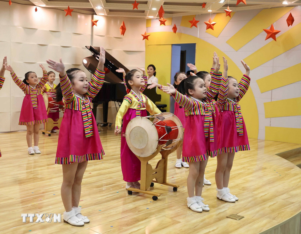 Chương trình biểu diễn văn nghệ chào mừng của các cháu thiếu nhi Trường mẫu giáo Kiêng Sang. (Ảnh: Thống Nhất/TTXVN)