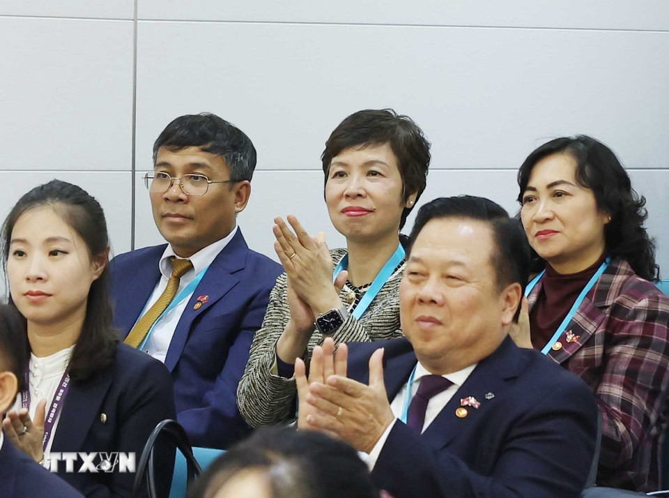 Các đại biểu đoàn Việt Nam tham dự buổi đến thăm Trường mẫu giáo Kiêng Sang và lớp học mang tên Chủ tịch Hồ Chí Minh của Tổng Bí thư Tô Lâm. (Ảnh: Thống Nhất/TTXVN)