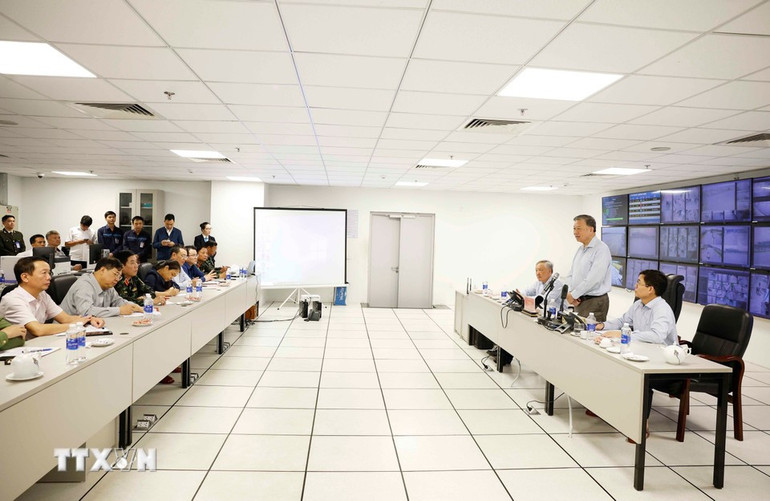 Tổng Bí thư Tô Lâm yêu cầu chính quyền địa phương không được chủ quan, phải coi phòng, chống bão lũ, thiên tai là một công tác trọng tâm hiện nay. (Ảnh: TTXVN)
