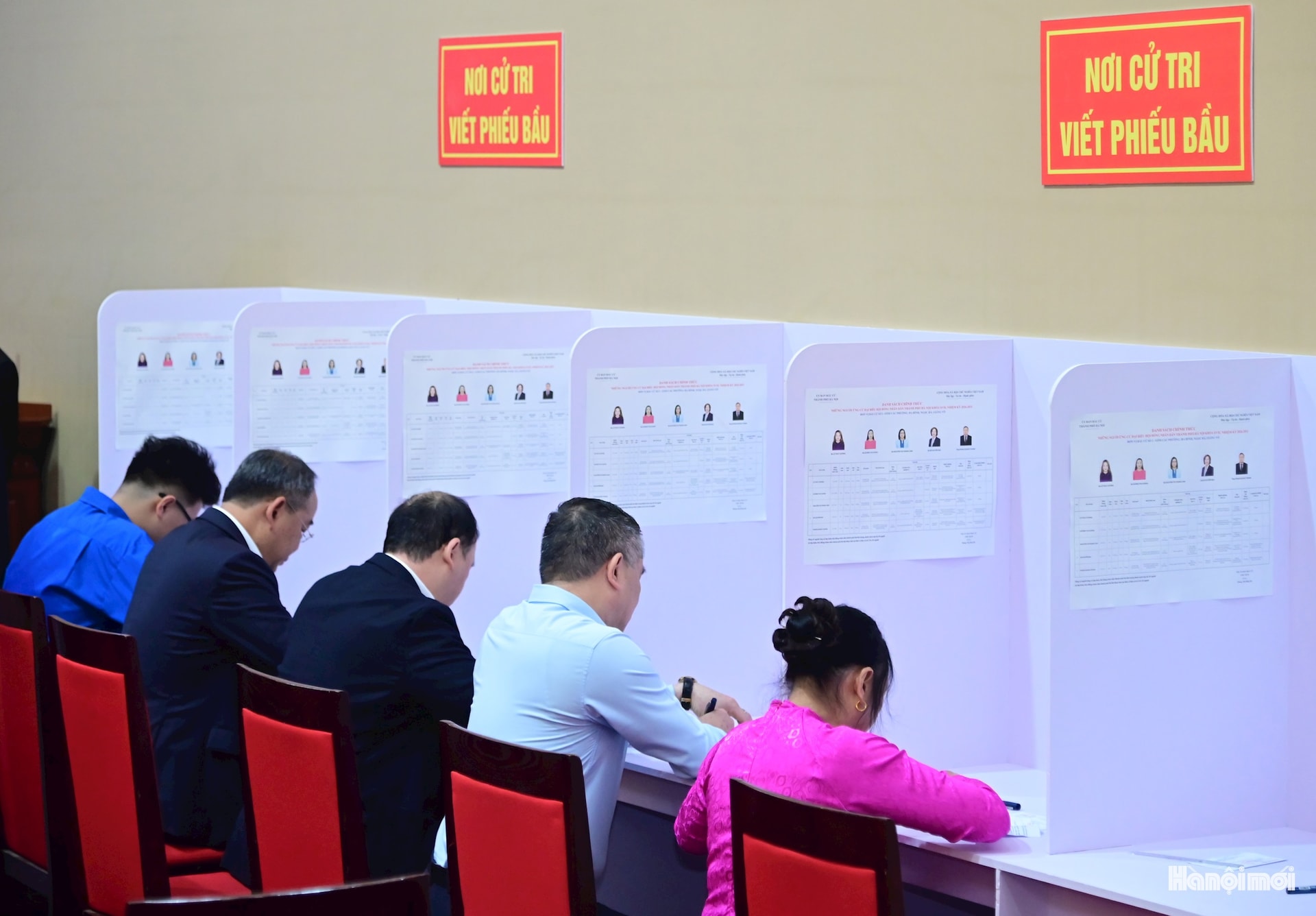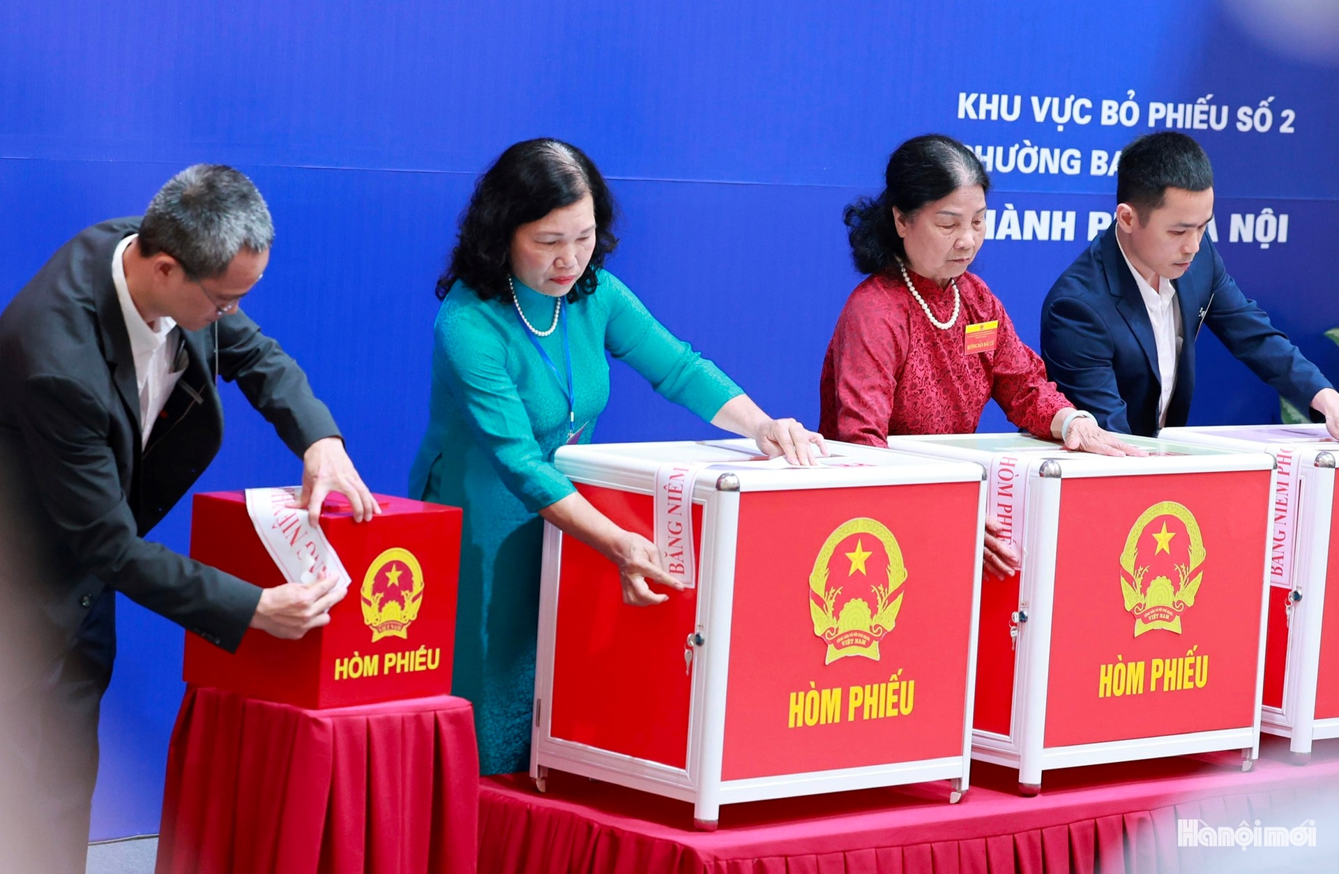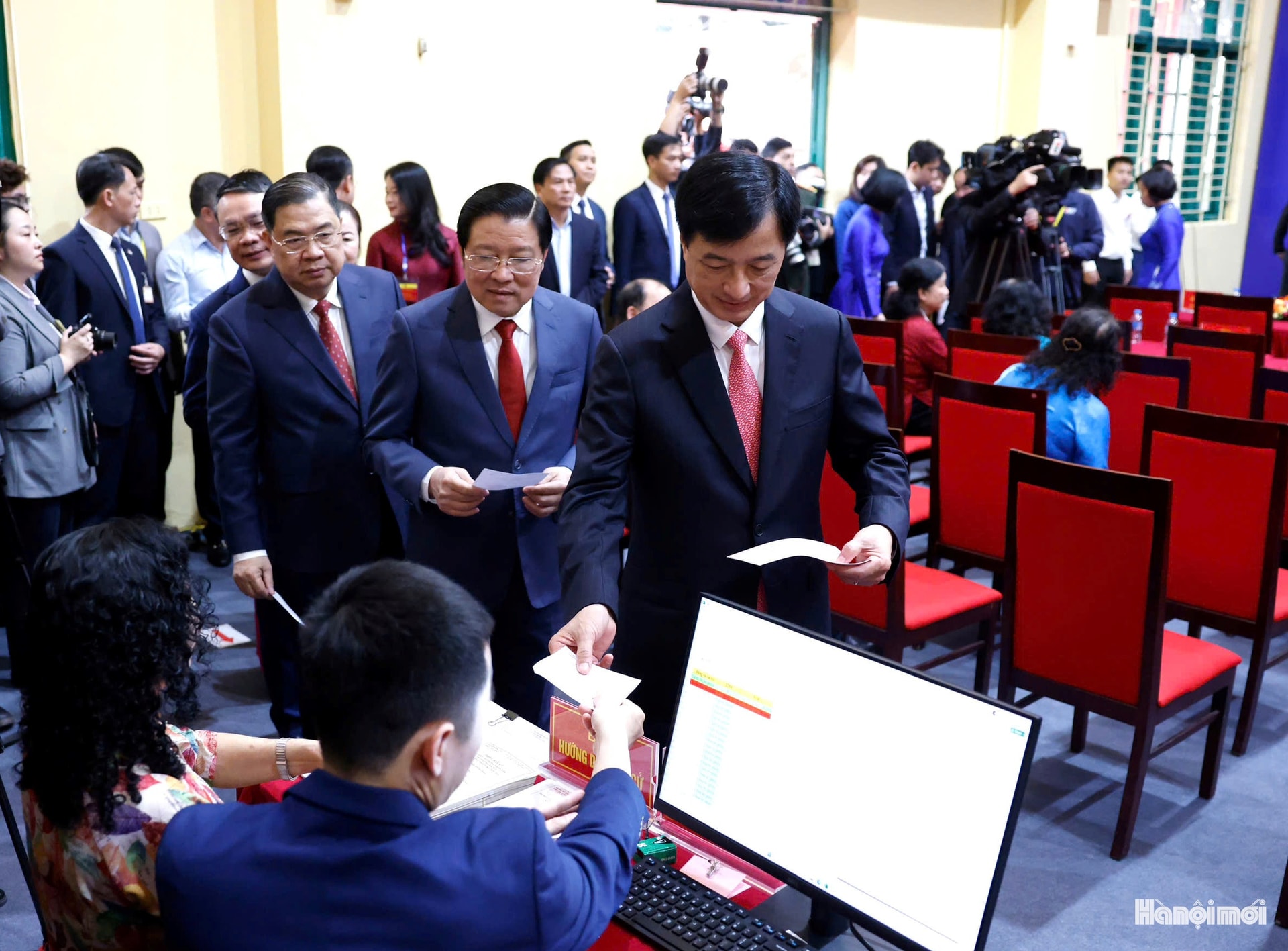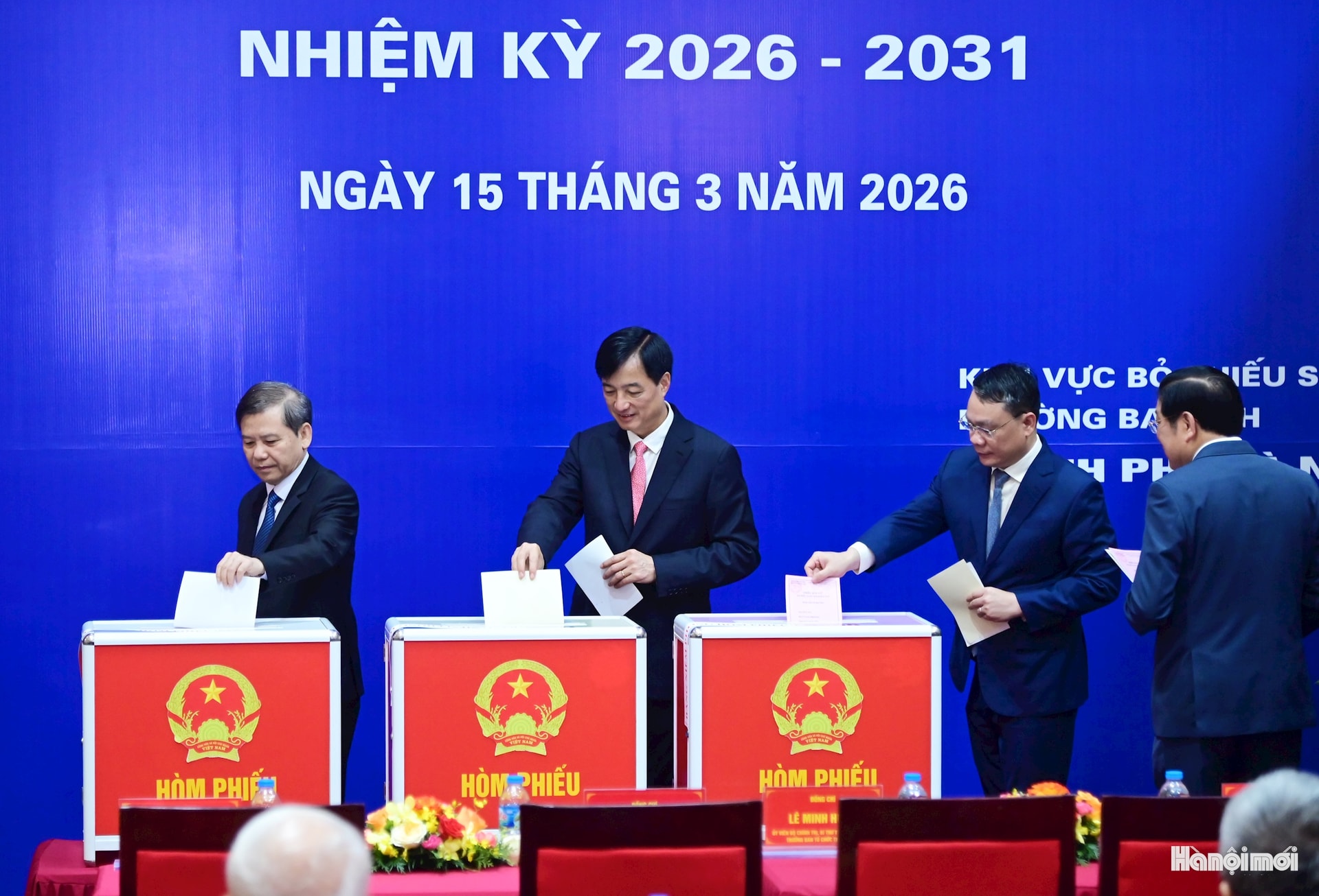 Bí thư Thành ủy Hà Nội Nguyễn Duy Ngọc (giữa) cùng các đồng chí lãnh đạo Đảng, Nhà nước bỏ phiếu bầu.