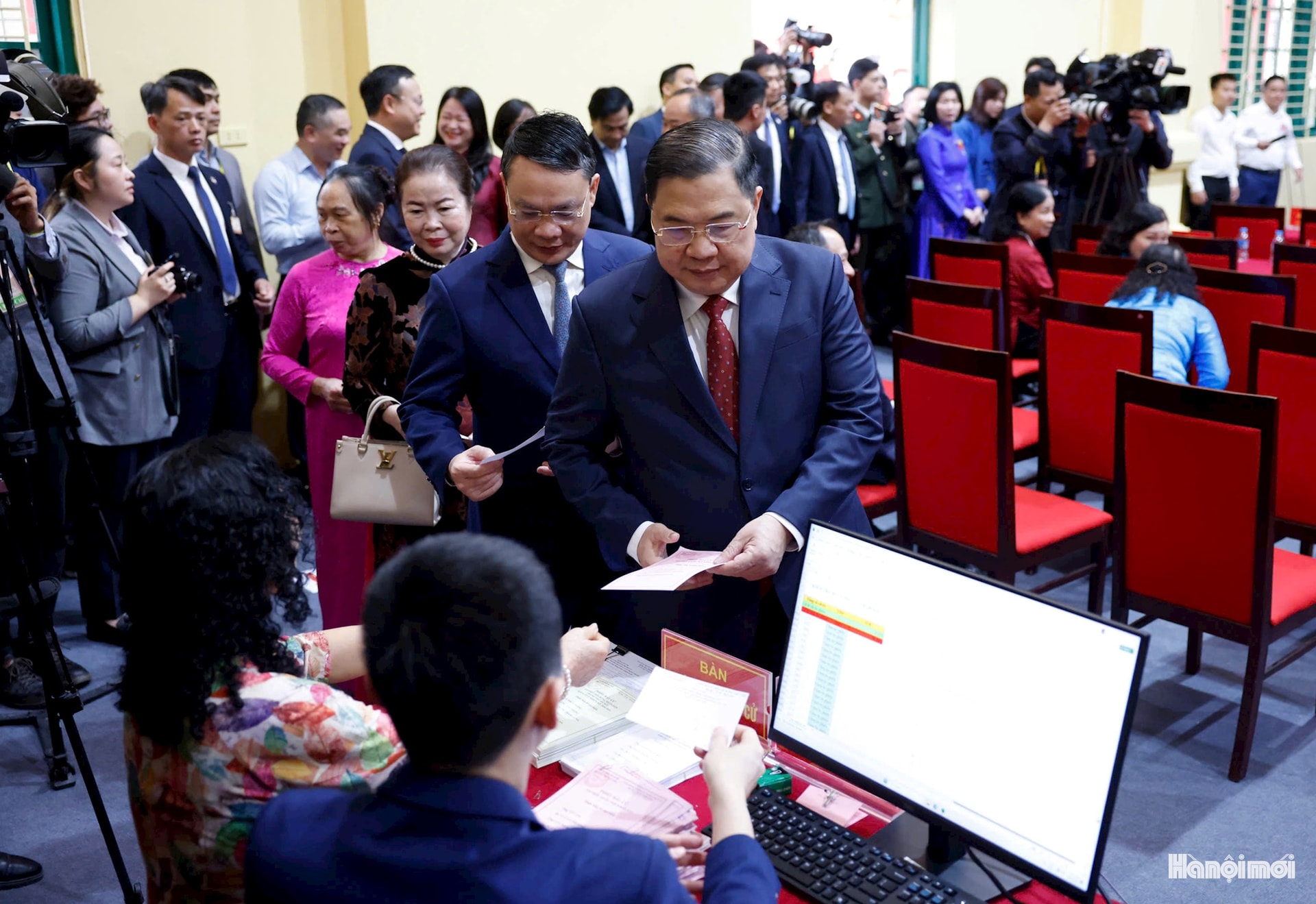 Bí thư Thành ủy Hà Nội Nguyễn Duy Ngọc nhận phiếu bầu cử.
