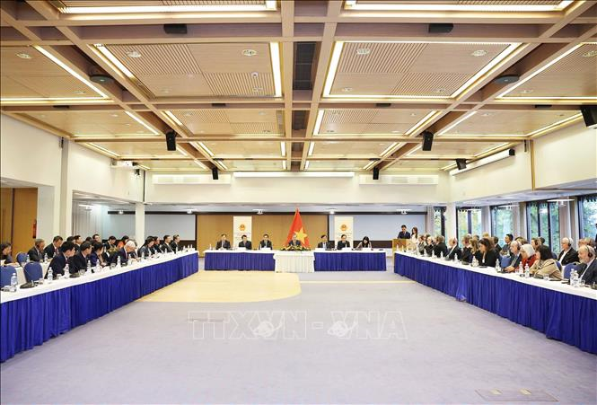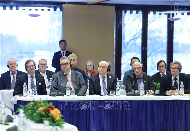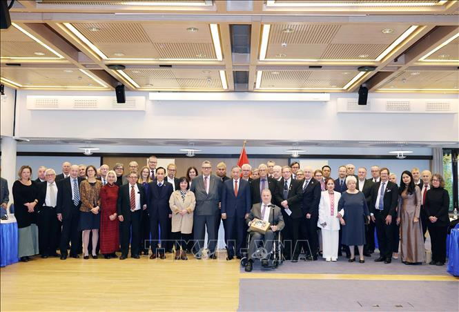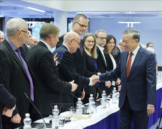 Tổng Bí thư Tô Lâm và đại biểu đoàn Việt Nam tại buổi tiếp Hội hữu nghị Phần Lan - Việt Nam và nhóm chuyên gia Phần Lan từng tham gia các dự án hỗ trợ tại Việt Nam.