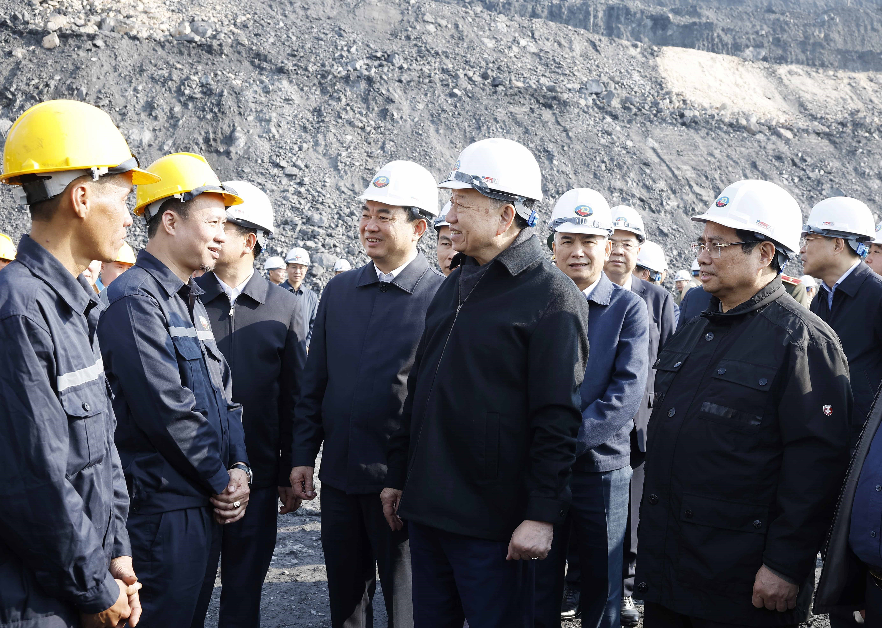 Tổng Bí thư Tô Lâm, Thủ tướng Phạm Minh Chính thăm, động viên cán bộ, công nhân Công ty Cổ phần Than Đèo Nai – Cọc Sáu, tỉnh Quảng Ninh (ẢNH: TTXVN)