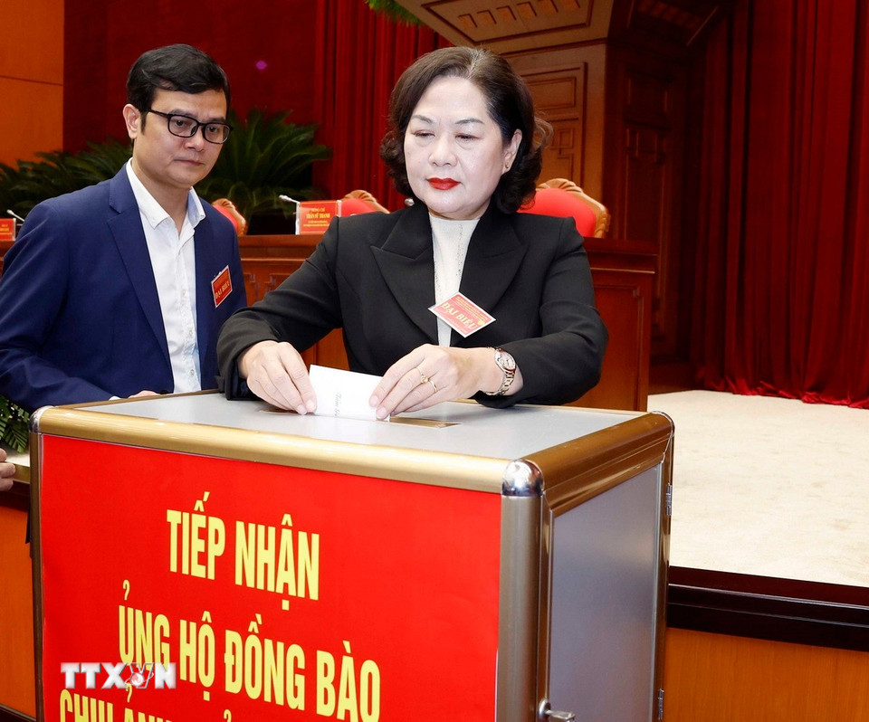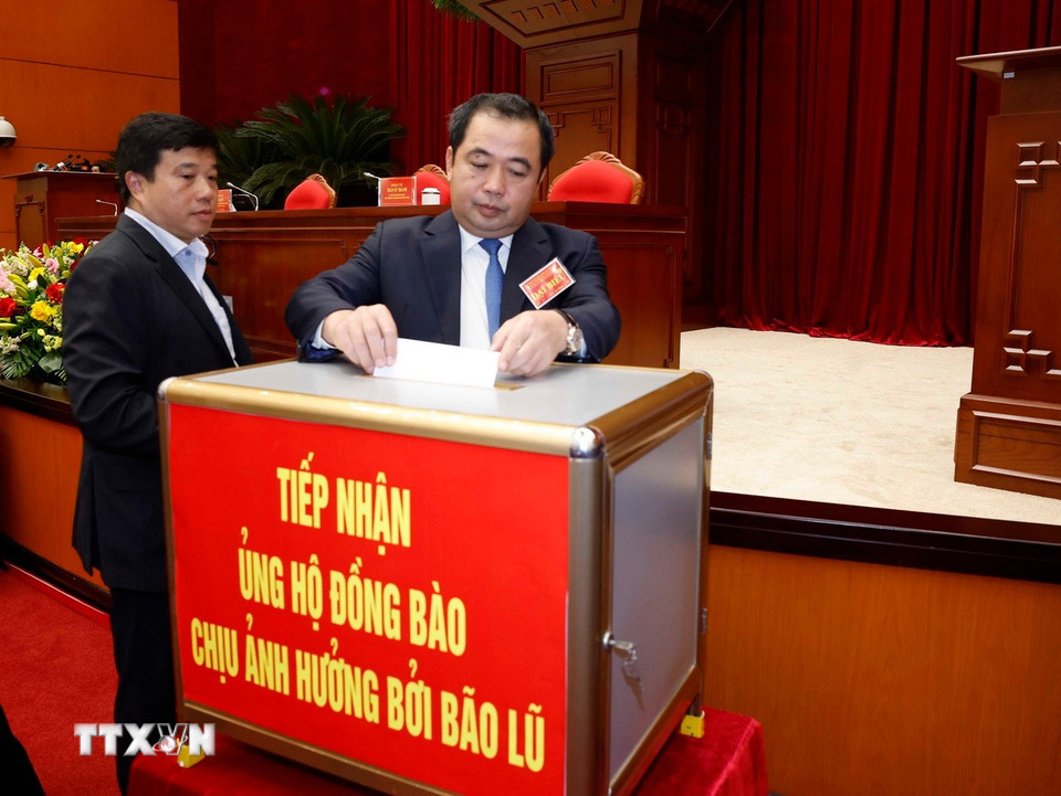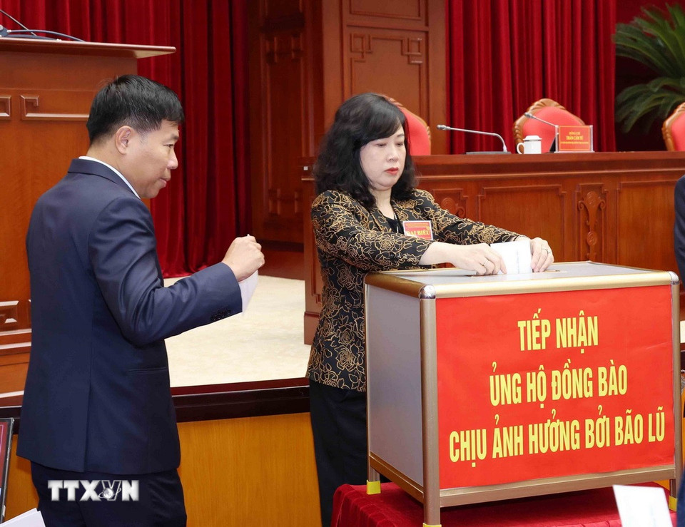 Ôngí Trần Cẩm Tú, Ủy viên Bộ Chính trị, Thường trực Ban Bí thư, quyên góp ủng hộ đồng bào chịu ảnh hưởng của lũ lụt. (Ảnh: Phương Hoa/TTXVN)