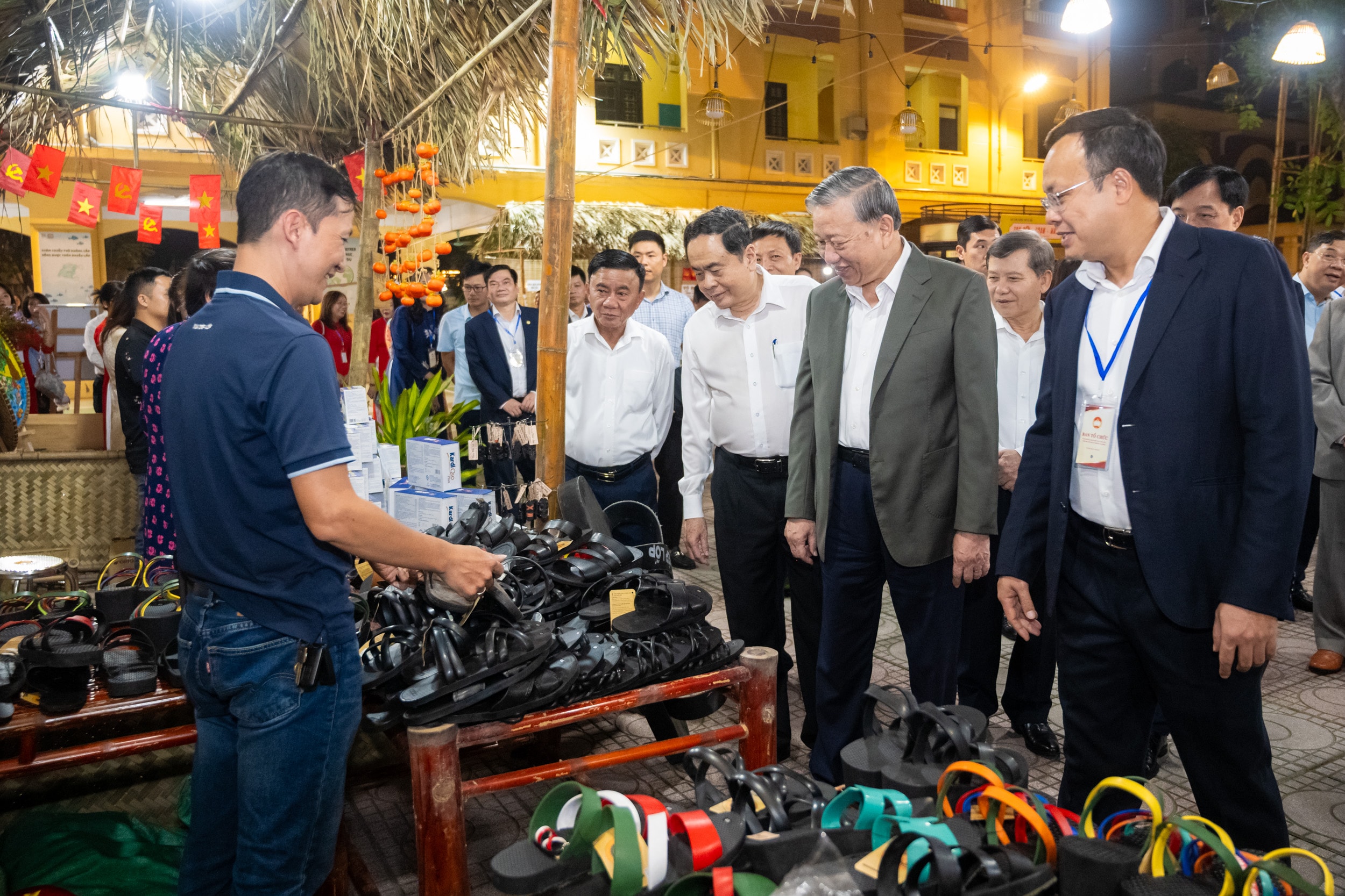 Tổng Bí thư Tô Lâm, Chủ tịch Quốc hội Trần Thanh Mẫn cùng các đại biểu tham quan các gian hàng OCOP tại Ngày hội