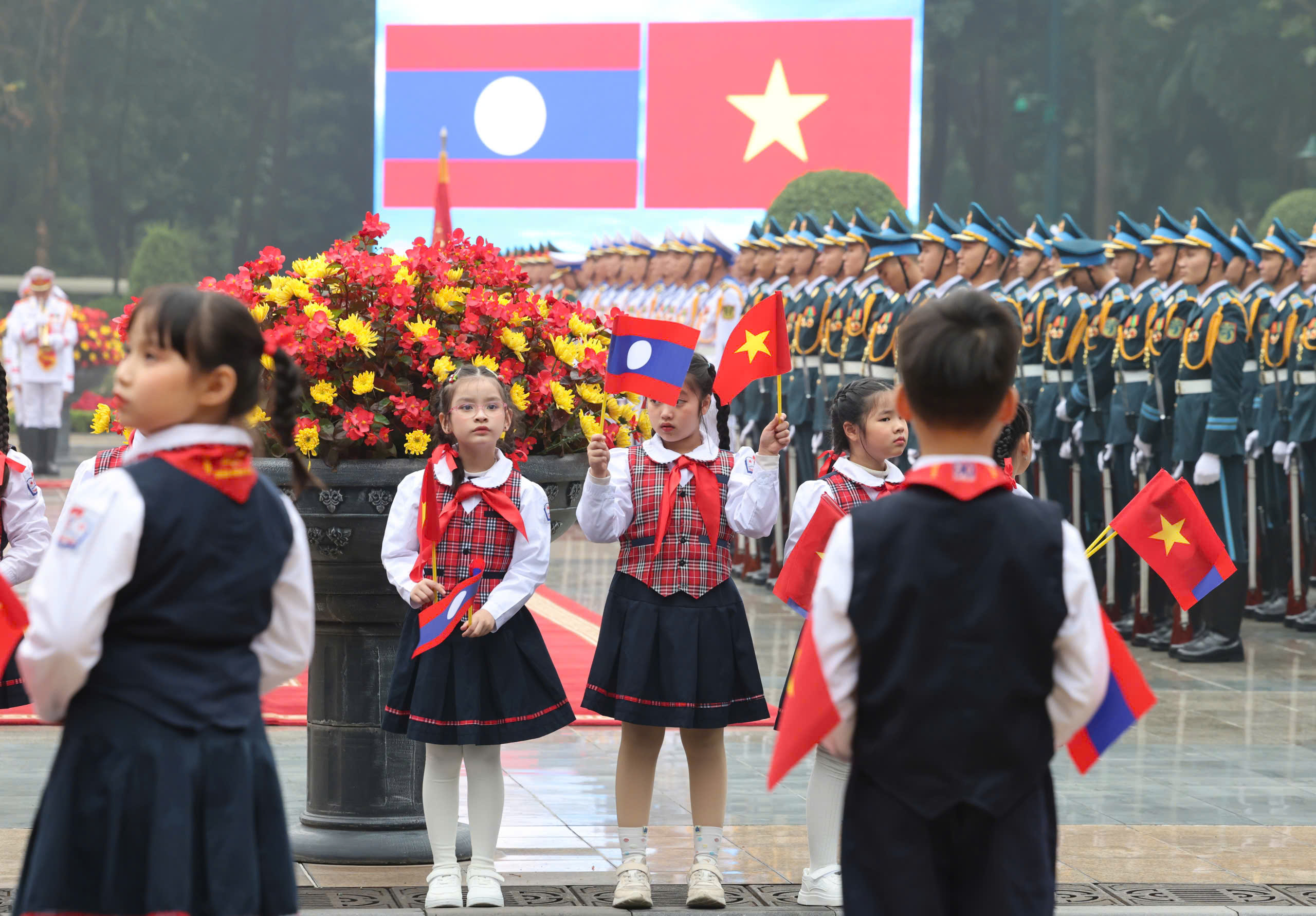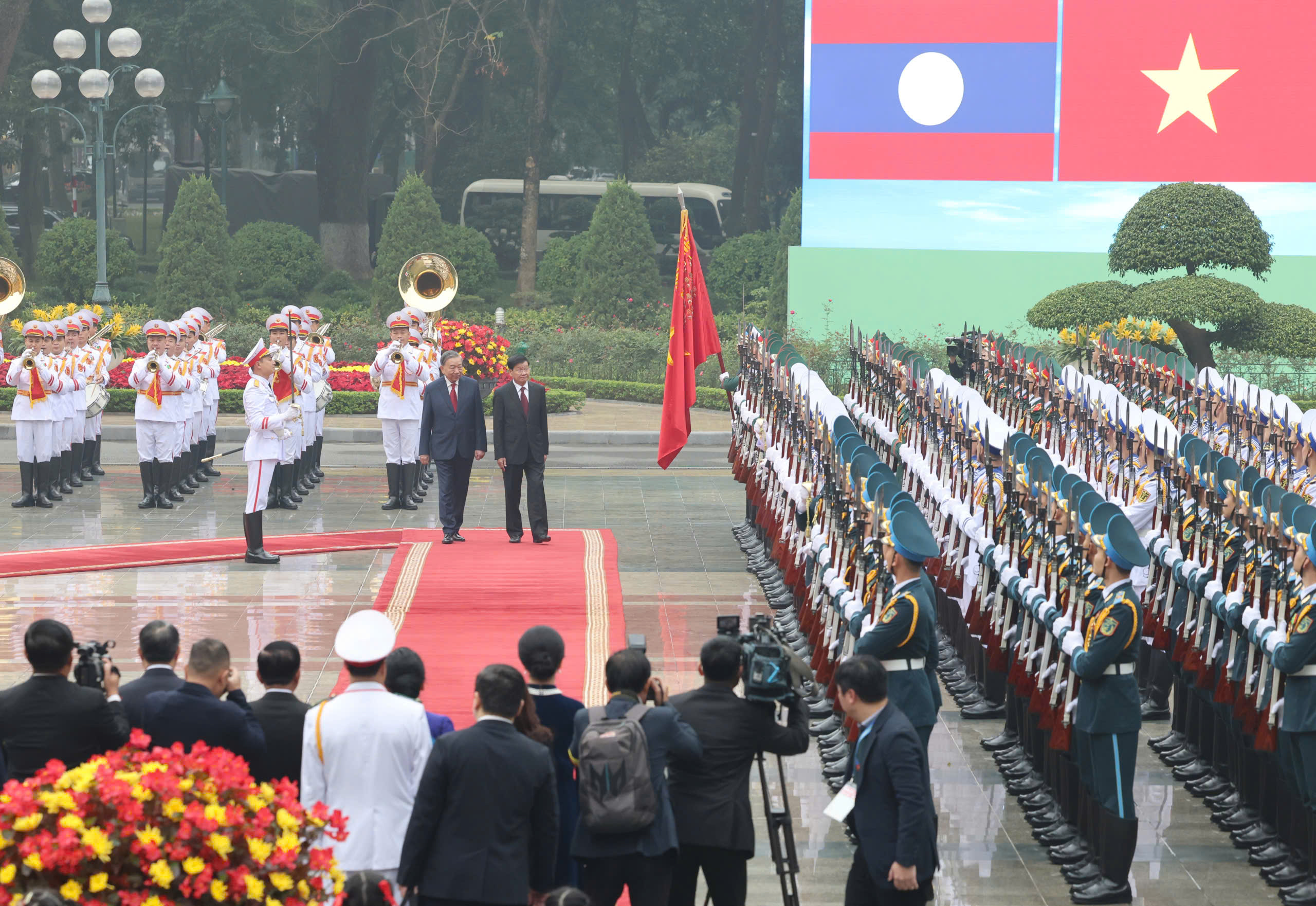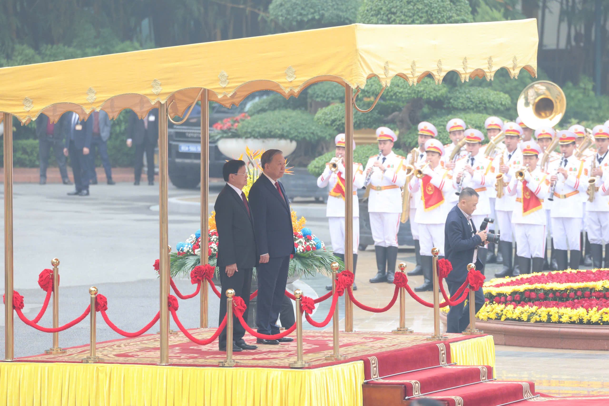 Tiếp đó, Tổng Bí thư Tô Lâm mời Tổng Bí thư Đảng Nhân dân Cách mạng Lào, Chủ tịch nước Cộng hòa Dân chủ Nhân dân Lào Thongloun Sisoulith duyệt đội danh dự Quân đội nhân dân Việt Nam.