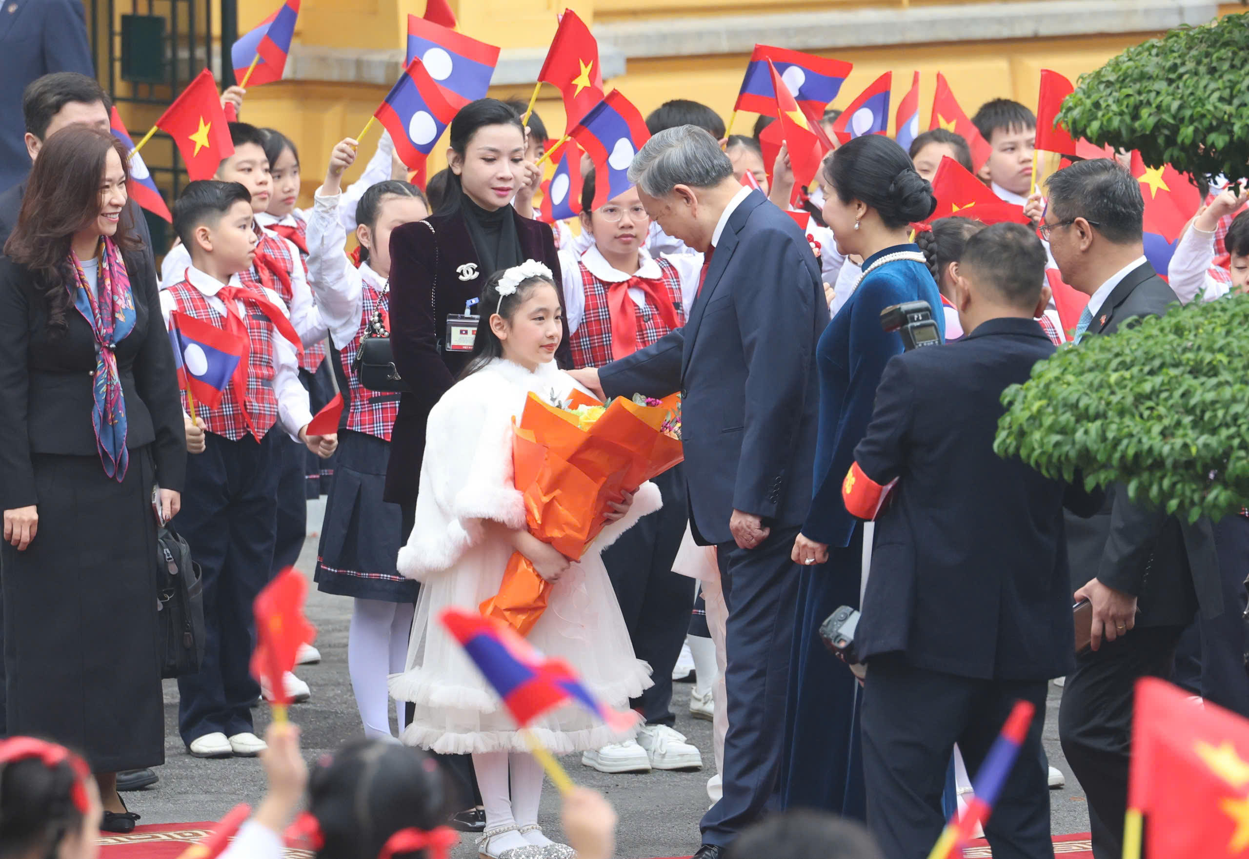 Tổng Bí thư Tô Lâm và phu nhân chủ trì lễ đón Tổng Bí thư Đảng Nhân dân Cách mạng Lào, Chủ tịch nước Cộng hòa Dân chủ Nhân dân Lào Thongloun Sisoulith và phu nhân. Ảnh: QUANG PHÚC