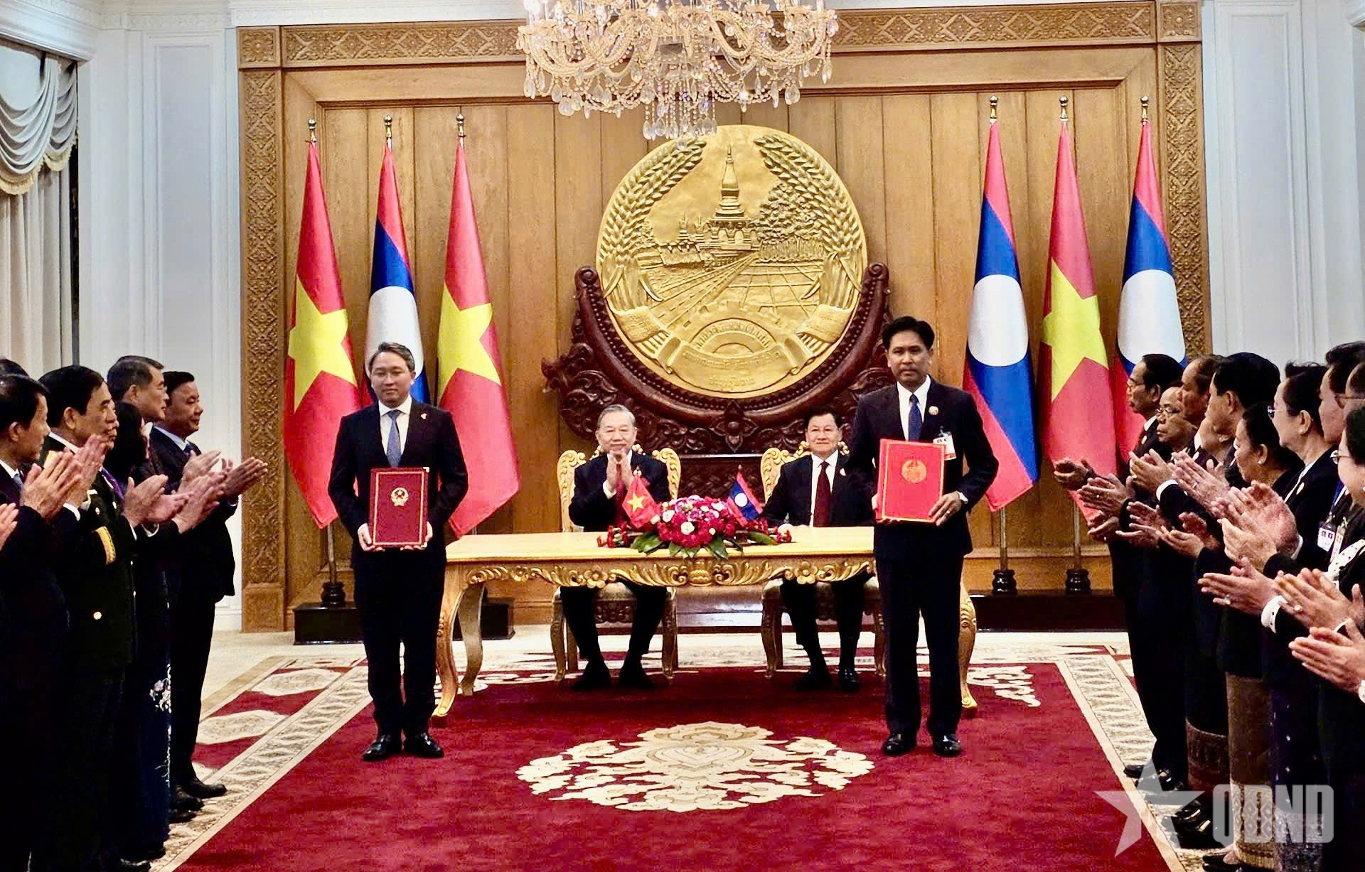 Tổng Bí thư Tô Lâm và Tổng Bí thư, Chủ tịch nước Lào Thongloun Sisoulith chứng kiến 2 Bộ Tư pháp trao thỏa thuận hợp tác.