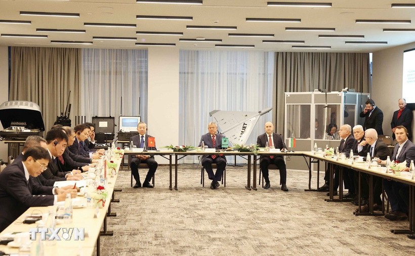 Trên nền tảng quan hệ hữu nghị truyền thống tốt đẹp và quan hệ Đối tác Chiến lược Việt Nam-Bulgaria mới được thiết lập, quan hệ quốc phòng, hợp tác công nghiệp quốc phòng đóng vai trò quan trọng trong tổng thể quan hệ hai nước, Tổng bí thư Tô Lâm mong muốn cùng chia sẻ kinh nghiệm, thúc đẩy hợp tác quốc phòng nói chung và hợp tác công nghiệp quốc phòng nói riêng giữa hai nước trong thời gian tới; hợp tác sản xuất thiết bị bay không người lái (drone) và thiết bị điện tử viễn thám… Ảnh: Thống Nhất/TTXVN.