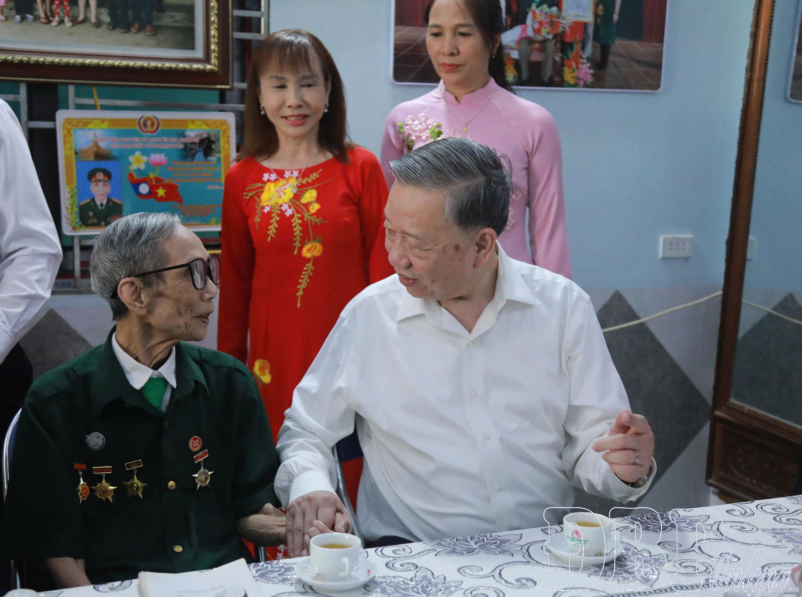 Tổng Bí thư Tô Lâm cùng chiến sĩ Điện Biên Phạm Văn Ngân trao đổi về lịch sử anh hùng chiến sĩ Điện Biên Phủ.
