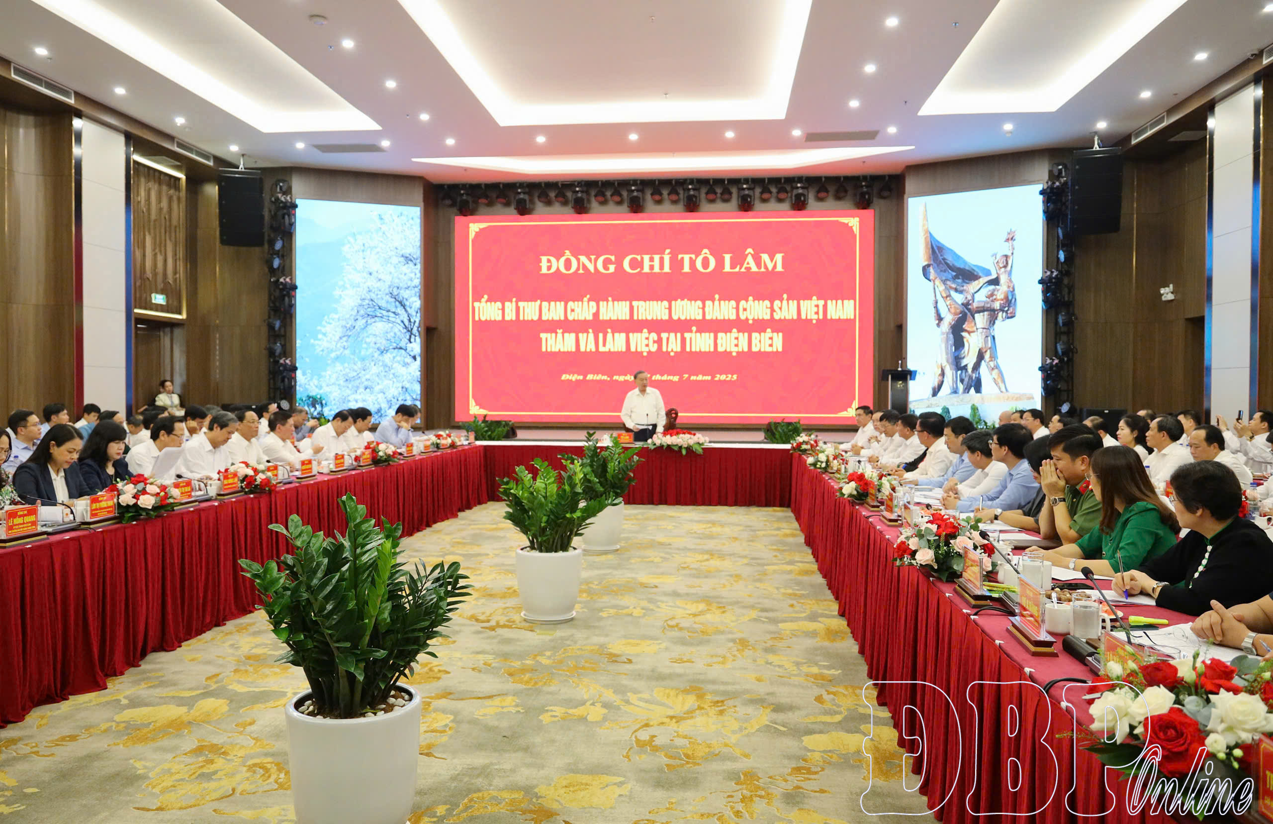 Cũng trong chuyến công tác, đồng chí Tô Lâm, Tổng Bí thư Ban Chấp hành Trung ương Đảng và đoàn đại biểu lãnh đạo Đảng, Nhà nước, Chính phủ đã có buổi làm việc với cán bộ chủ chốt tỉnh Điện Biên về thực hiện nhiệm vụ phát triển kinh tế - xã hội, đảm bảo quốc phòng - an ninh, an sinh xã hội trên địa bàn tỉnh.