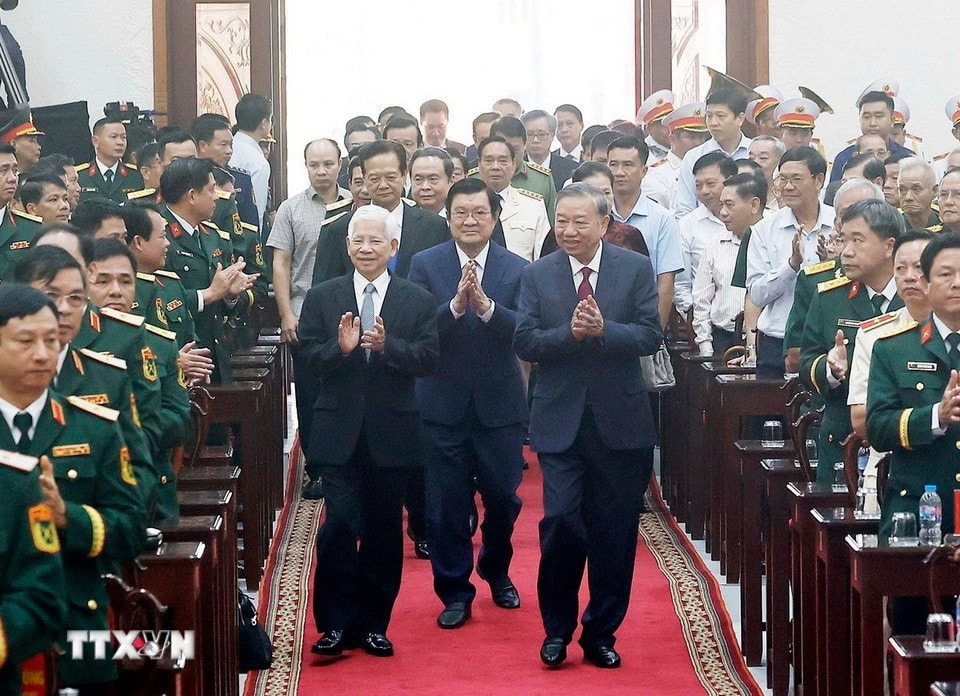 Tổng Bí thư Tô Lâm, các đồng chí lãnh đạo, nguyên Chủ tịch nước: Nguyễn Minh Triết, Trương Tấn Sang; nguyên Thủ tướng Chính phủ Nguyễn Tấn Dũng; Ủy viên Bộ Chính trị, Chủ tịch Quốc hội Trần Thanh Mẫn; nguyên Chủ tịch Quốc hội Nguyễn Thị Kim Ngân; nguyên Thường trực Ban Bí thư Lê Hồng Anh tới dự Lễ kỷ niệm 80 năm Ngày truyền thống Lực lượng vũ trang Quân khu 9 (10/12/1945 – 10/12/2025). Ảnh: Thống Nhất – TTXVN