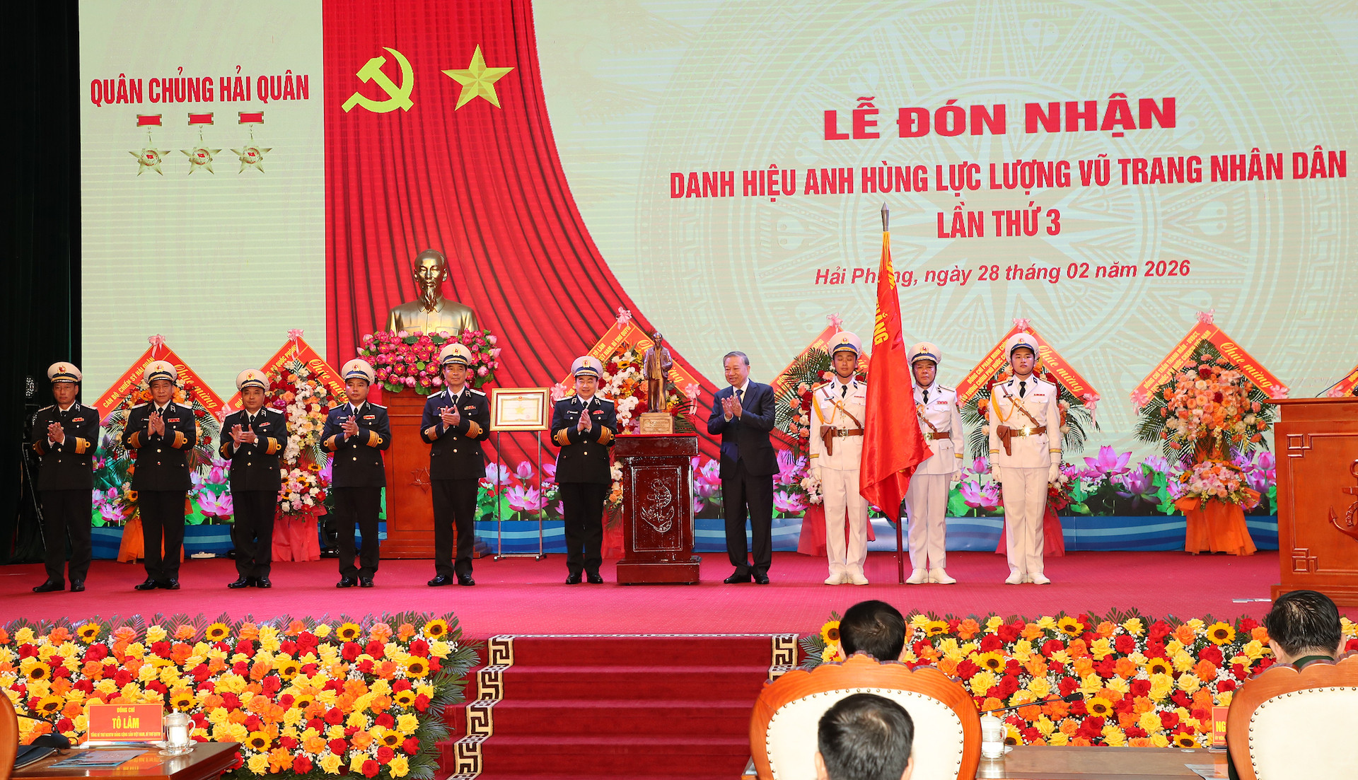Tổng Bí thư Tô Lâm gắn Huy hiệu danh hiệu Anh hùng Lực lượng vũ trang nhân dân lên Quân kỳ quyết thắng và trao danh hiệu Anh hùng Lực lượng vũ trang nhân dân tặng Quân chủng Hải quân