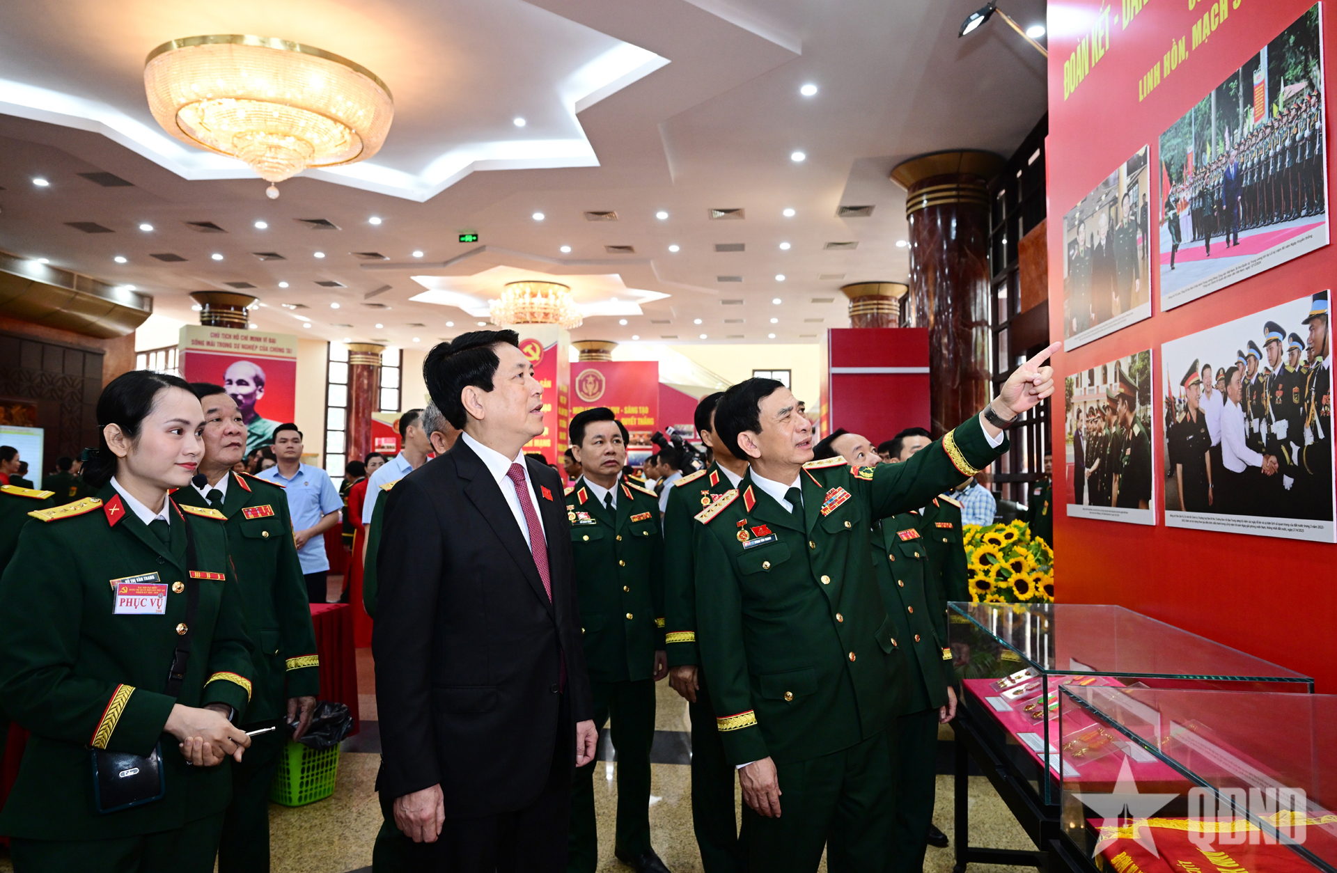 Chủ tịch nước Lương Cường và các đại biểu tham quan gian trưng bày phục vụ Đại hội trước buổi làm việc. (Ảnh: QĐND)