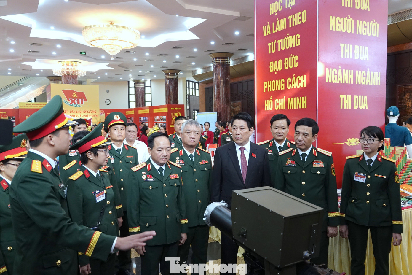 Đại tướng Phan Văn Giang - Ủy viên Bộ Chính trị, Phó Bí thư Quân ủy Trung ương, Bộ trưởng Bộ Quốc phòng, giới thiệu với Chủ tịch nước Lương Cường về khu trưng bày của Đại hội.