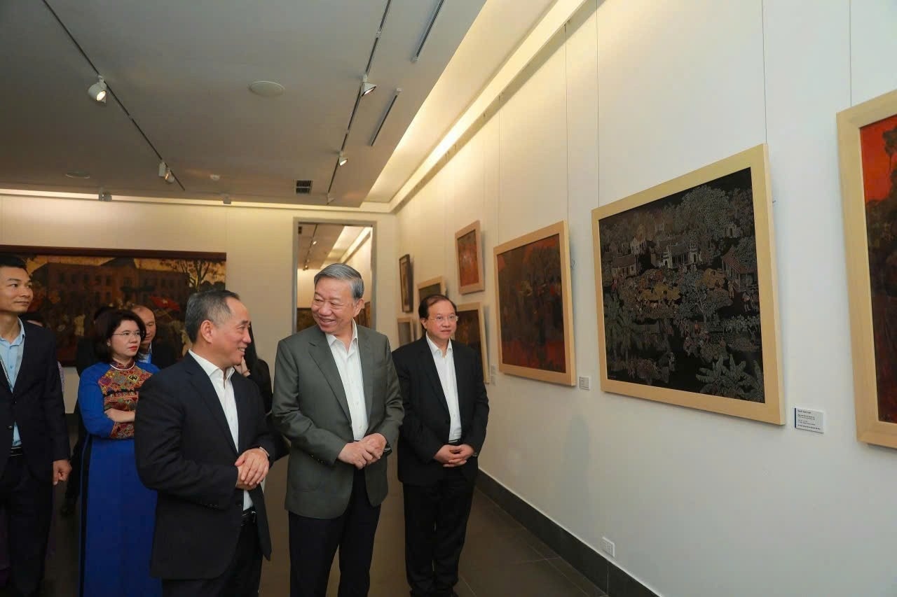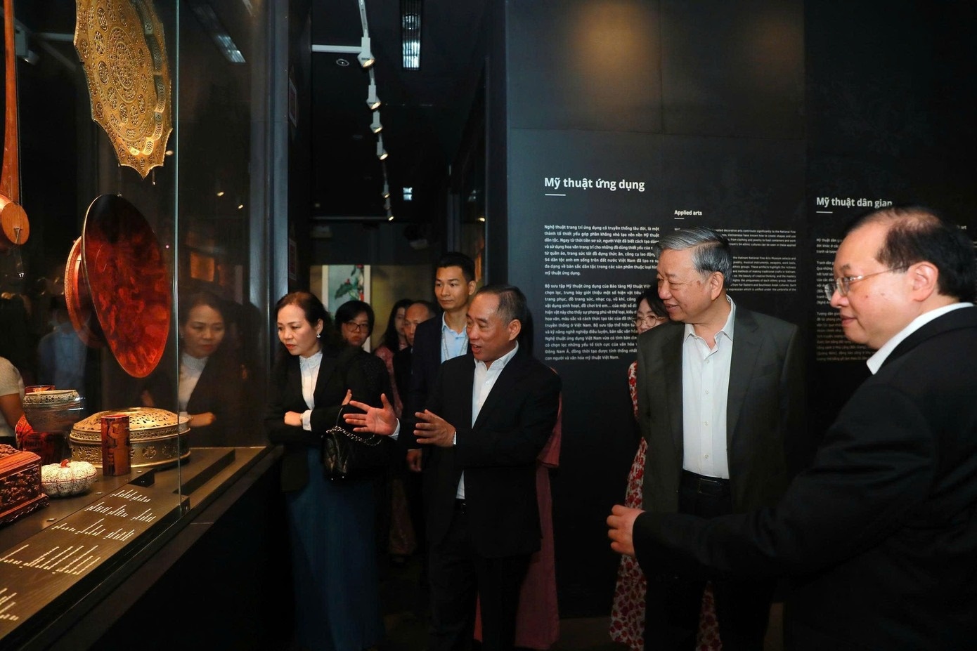 Bên cạnh tham quan triển lãm, Tổng Bí thư đã dành thời gian tham quan các khu trưng bày và đặc biệt chú ý đến các bảo vật quốc gia đang được lưu giữ tại bảo tàng. Dịp này, Tổng Bí thư Tô Lâm đánh giá cao nỗ lực của Bảo tàng Mỹ thuật Việt Nam, đặc biệt là việc chủ động ứng dụng công nghệ số trong việc phát huy giá trị các tác phẩm nghệ thuật.