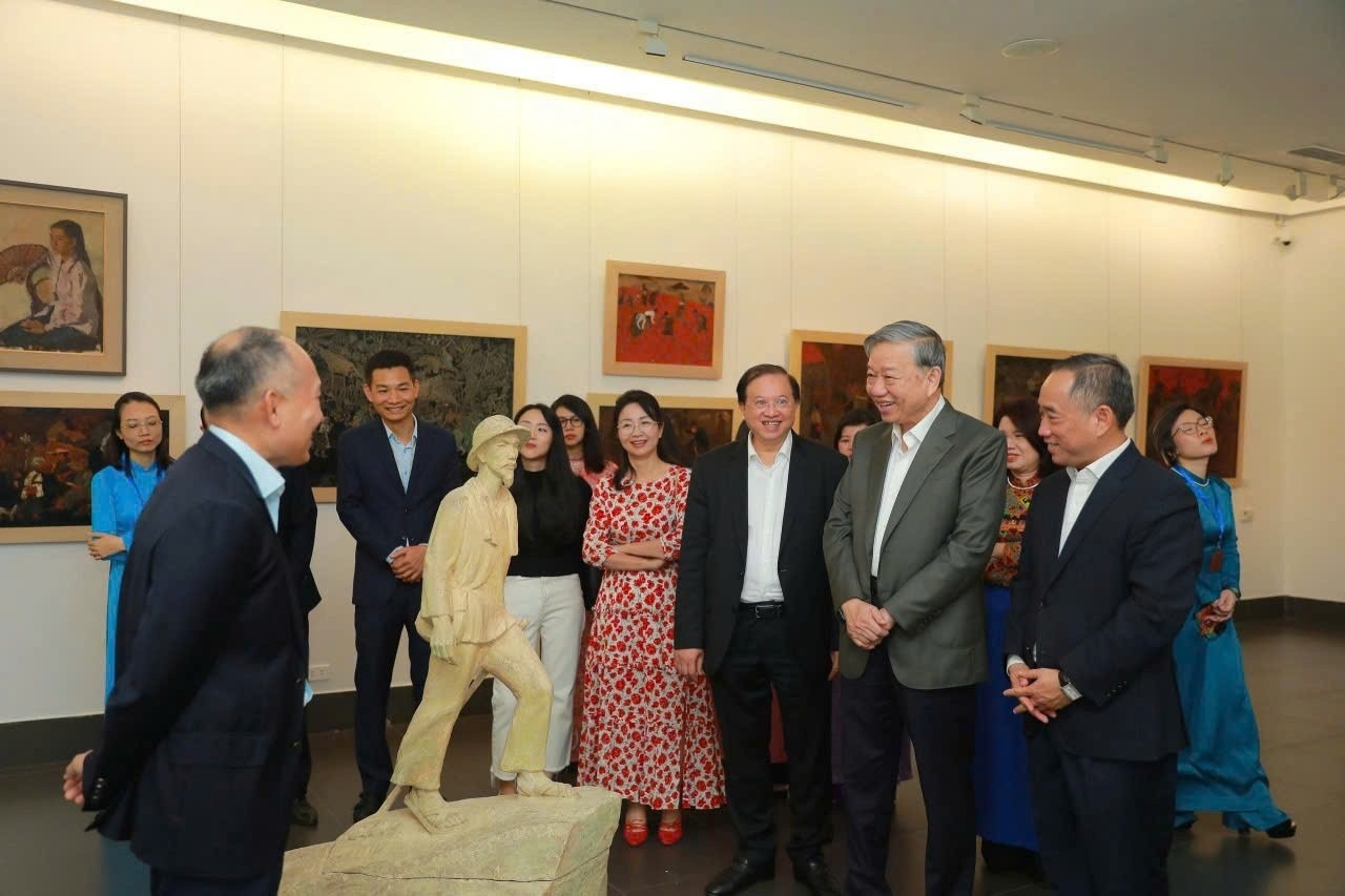 Sáng 16/11, Tổng Bí thư Tô Lâm cùng phu nhân Ngô Phương Ly đã đến thăm Bảo tàng Mỹ thuật Việt Nam và tham quan triển lãm 100 năm Mỹ thuật hiện đại. Đón tiếp đoàn là ông Tạ Quang Đông - Thứ trưởng Bộ Văn hóa, Thể thao và Du lịch, ông Nguyễn Anh Minh - Giám đốc Bảo tàng Mỹ thuật Việt Nam cùng các cán bộ chủ chốt của bảo tàng.